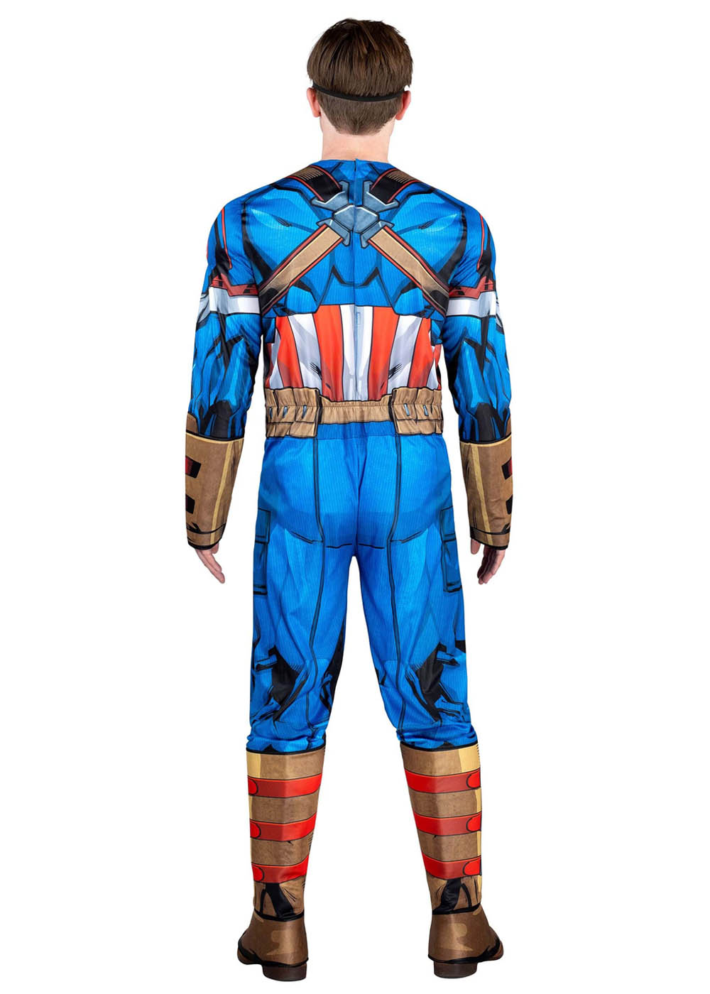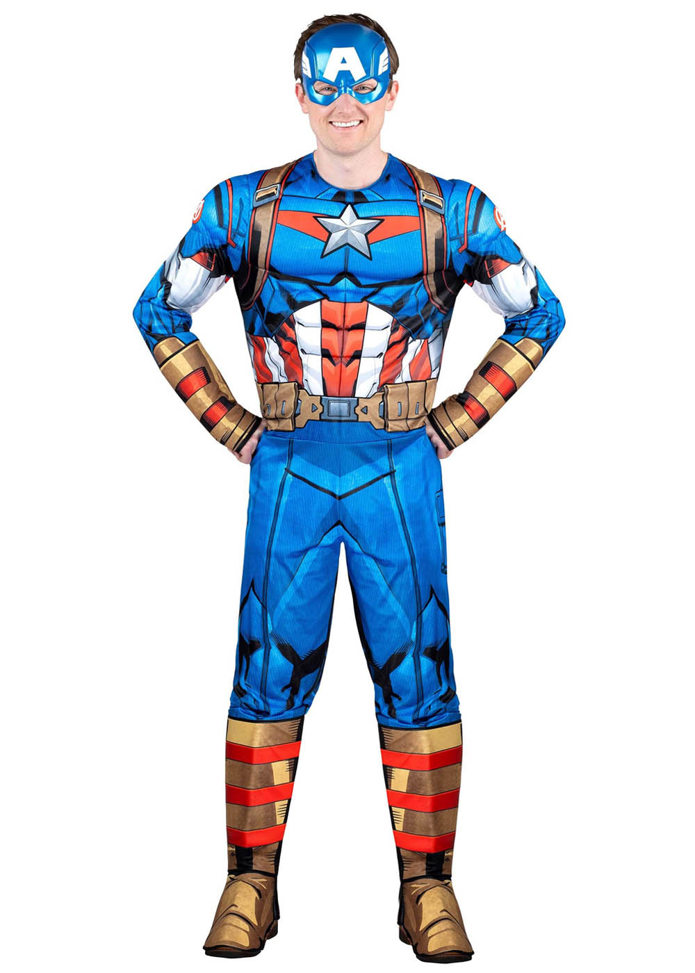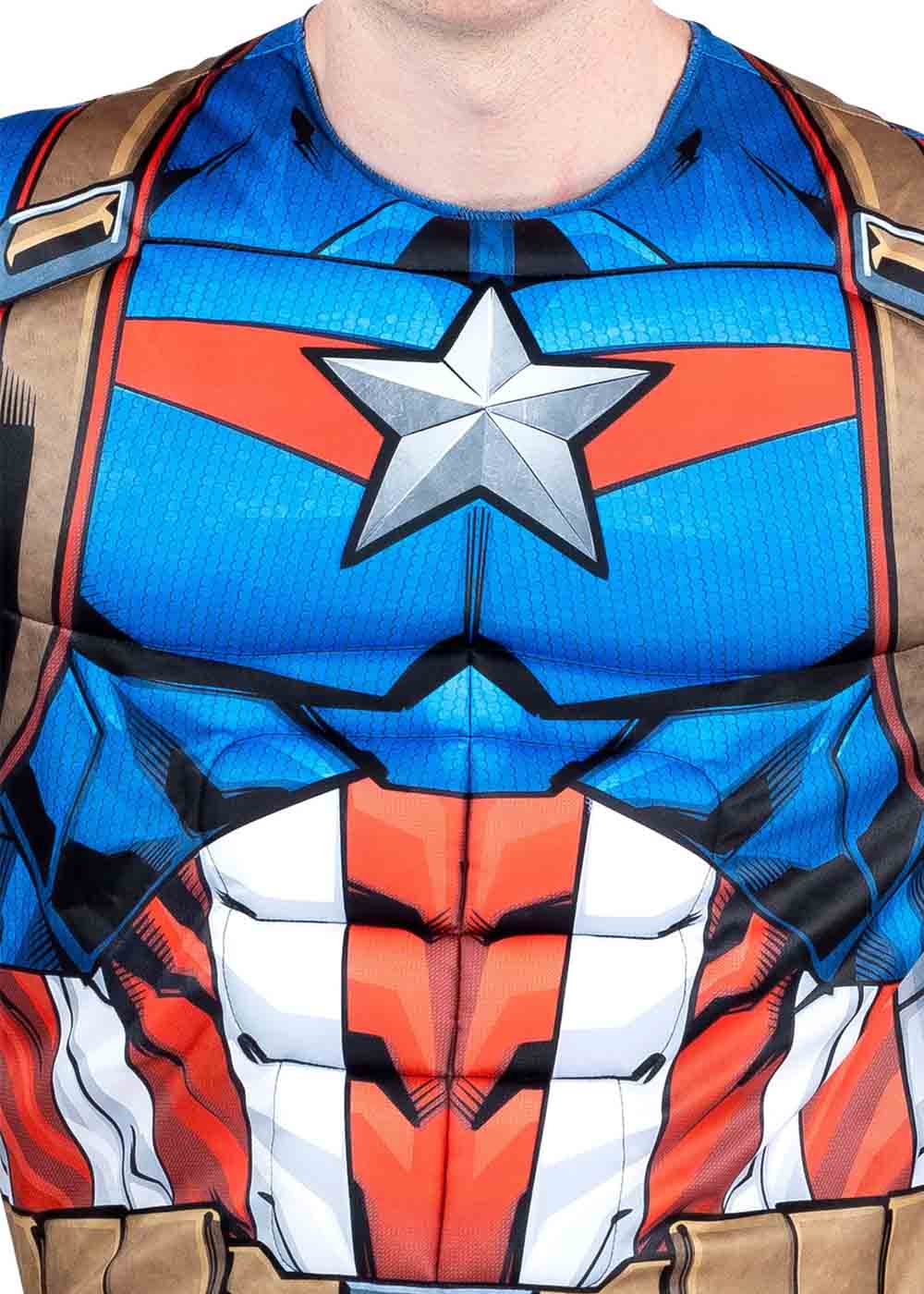 Костюм Капитана Америки включает комбинезон с застежкой на липучке в центре спины. Эластичный пояс на спине обеспечивает комфортную посадку. Мягкие подкладки в области груди и плеч создают мускулистый вид. Литая пластиковая маска покрывает верхнюю часть лица и имеет эластичную резинку вокруг головы.