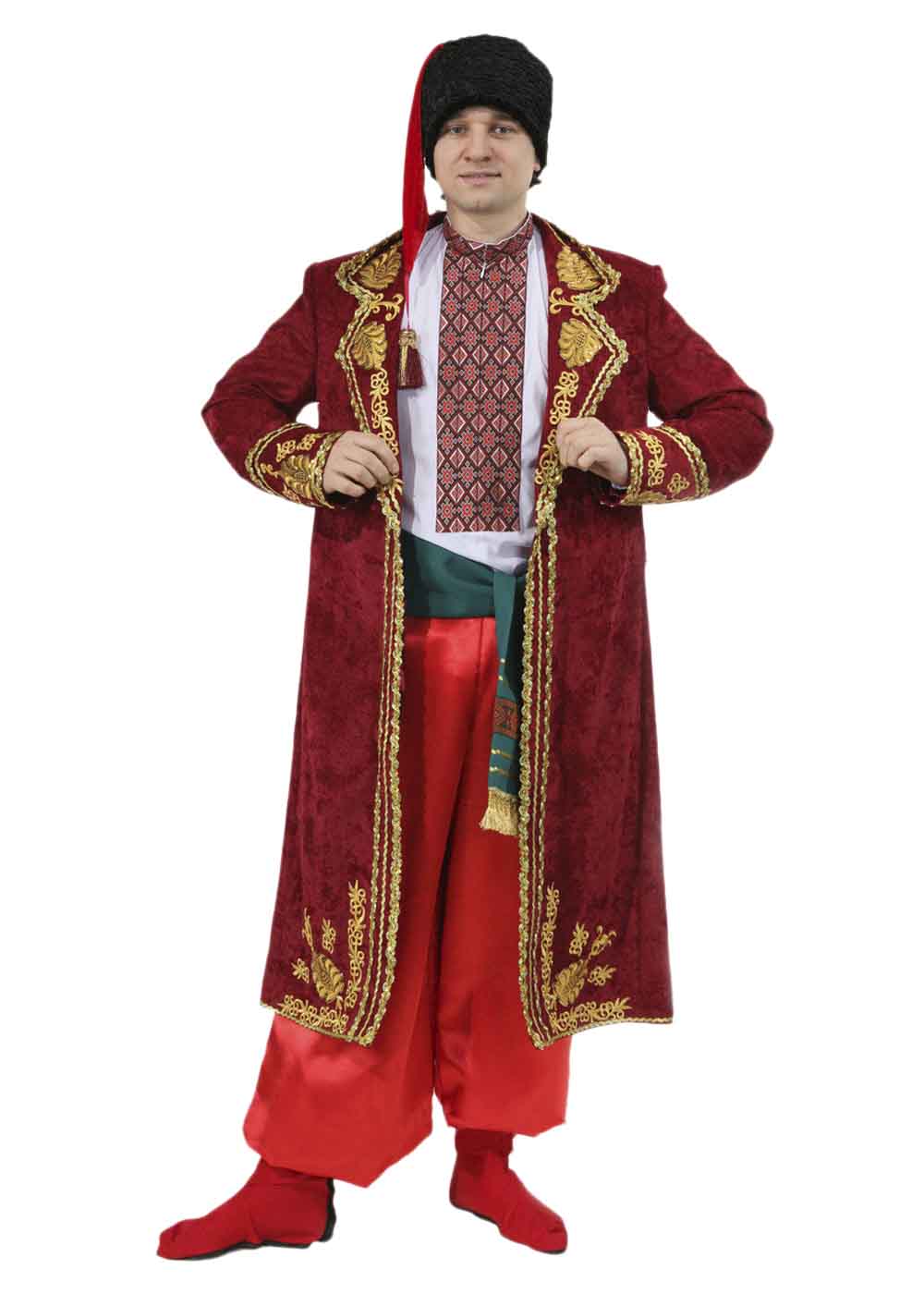 Мужской костюм "Козак" воссоздает исторический образ запорожского казака, подчеркивая его мужественность и благородство. Этот костюм идеально подходит для театральных постановок, праздников и исторических реконструкций. Бордовая свита с золотой вышивкой добавляет роскоши и торжественности, а шаровары и рубашка создают аутентичный вид. Комплект состоит из рубашки, шаровар, пояса, свиты и шапки. Материалы: хлопок, габардин, искусственный мех, микровельвет.
