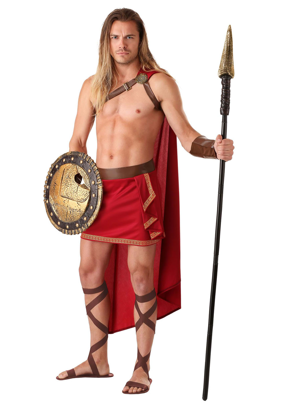 Воплотите мощь и храбрость спартанца в этом брутальном костюме! Юбка из трикотажа застегивается на липучку сзади и с поясом. Подол юбки обрамлен узором, придавая ему аутентичный вид. Манжеты на руки из искусственной кожи с эластичной вставку из трикотажа для плотной посадки. Плащ пришит к верхнему краю кожаной повязки. Повязка украшена медальоном в античном стиле на правом плече и металлической пряжкой на плечевом ремне.