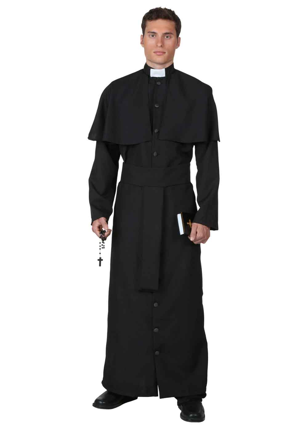 Мужской костюм священника включает костюм с застежкой на пуговицы спереди и липучку на воротнике. К нему пришита мантия на плечах.