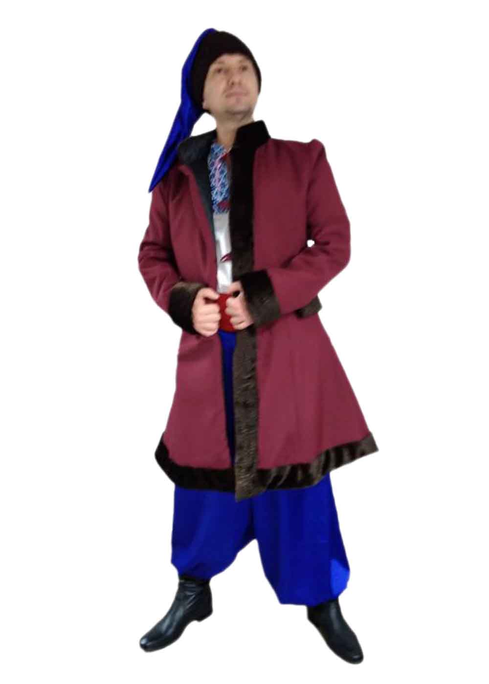 Мужской национальный полушубок представляет собой важный элемент традиционного украинского костюма. Выполненный из габардина, он украшен искусственным мехом, что придает ему особую торжественность и тепло. Полушубок идеально подходит для холодных сезонов и прекрасно дополняет любой наряд. Его можно сочетать с вышиванкой и шароварами, создавая гармоничный и аутентичный образ. Полушубок шьется на заказ по индивидуальным меркам, что обеспечивает идеальную посадку и комфорт. Также можно приобрести дополнительные аксессуары, такие как головной убор и пояс, для завершения образа. Этот полушубок идеально подойдет для театральных постановок, исторических реконструкций и фольклорных мероприятий.