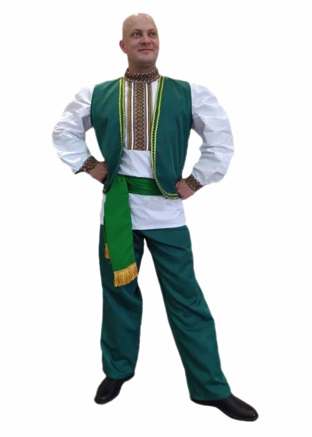 Мужской народный костюм Донецкий отличается яркостью и утонченностью. Костюм состоит из жилета, рубашки, штанов и пояса, выполненных из габардина и рубашечной ткани. Жилет и штаны имеют насыщенный зеленый цвет, который гармонично сочетается с традиционной вышивкой на рубашке. Завершает образ яркий пояс с кистями.