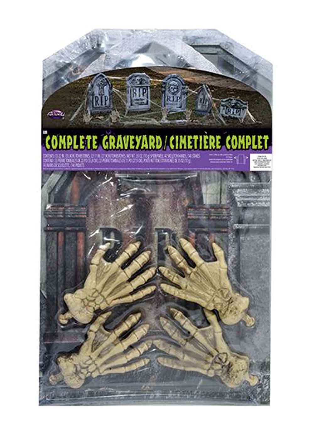 Набор декора Скелет - идеальное решение для создания мрачной и загадочной атмосферы Хэллоуина. В комплекте представлены пластиковые руки-скелетоны, каждая из которых длиной 16 см. Кроме того, в наборе содержатся 3 картонных надгробия высотой 56 см и 2 надгробия высотой 28 см. Эти элементы позволяют создать собственное кладбище прямо у себя во дворе или в помещении. Паутину, входящую в комплект, можно растянуть и украсить по вашему вкусу, добавляя к ней паучков или другие декоративные элементы. Все надгробия и руки легко прикрепить к земле, обеспечивая им надежную устойчивость.