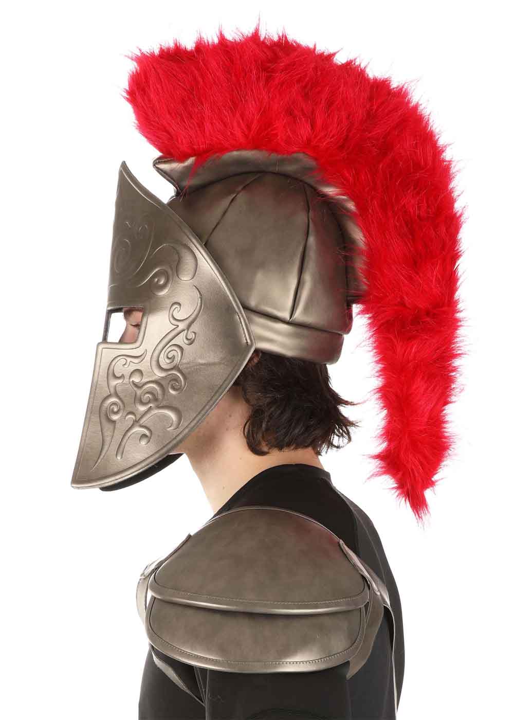 Набор Гладиатора Шлем, это великолепное снаряжение для тех, кто готов вступить в бой на арене. Этот шлем изготовлен из прочной искусственной кожи, дополненный гребнем из набивного искусственного меха, который придает ему внушительный вид. Встроенная шапка оснащена застежкой-липучкой для регулировки размера, обеспечивая комфортную посадку. Прикрепленная маска закрывает большую часть лица, создавая загадочный образ. Наплечник с лямкой под одной подмышкой и лямкой через плечо под противоположной рукой обеспечивает надежное крепление. Ремешок через плечо застегивается на металлическую пряжку бронзового цвета, придавая шлему завершенный воинский вид.