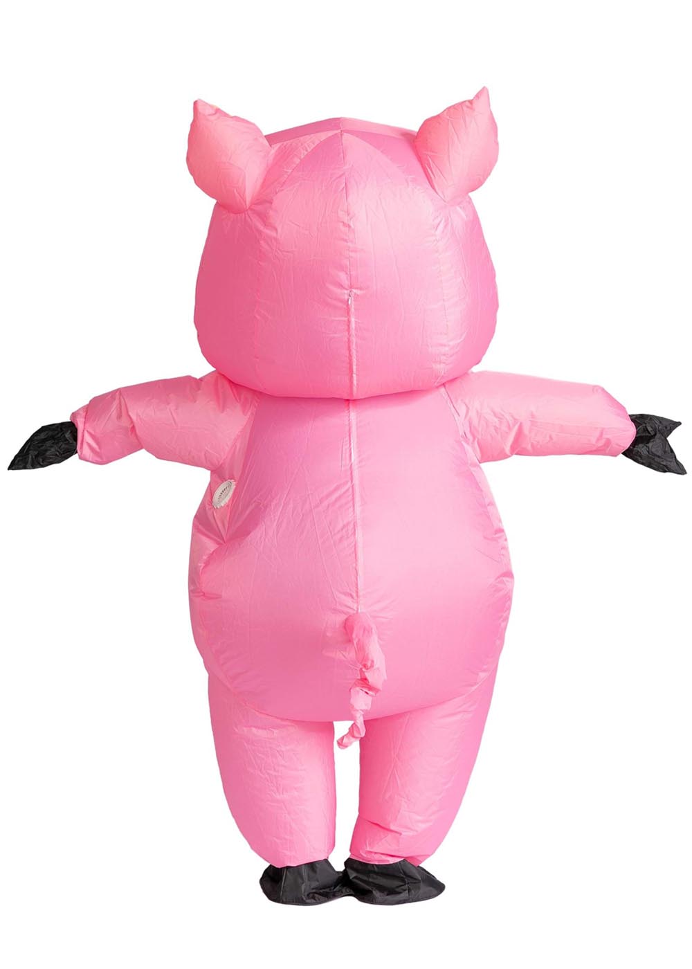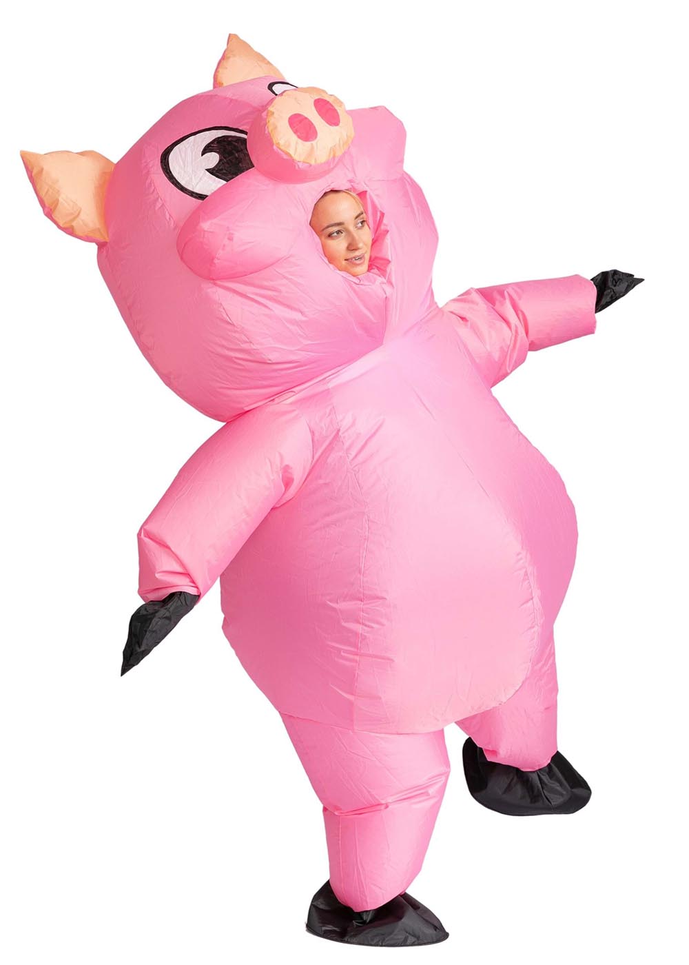 Надувной костюм Свинки представляет собой комбинезон с молнией на спине. Отверстие для лица оборудовано эластичной лентой для комфортной посадки. Комплект включает в себя пару рукавиц с эластичными лентами. Вентилятор расположен на правой задней стороне, отсек для батареек находится в кармане. Для роботы требуется 4 батарейки типа АА, не включены в комплект.