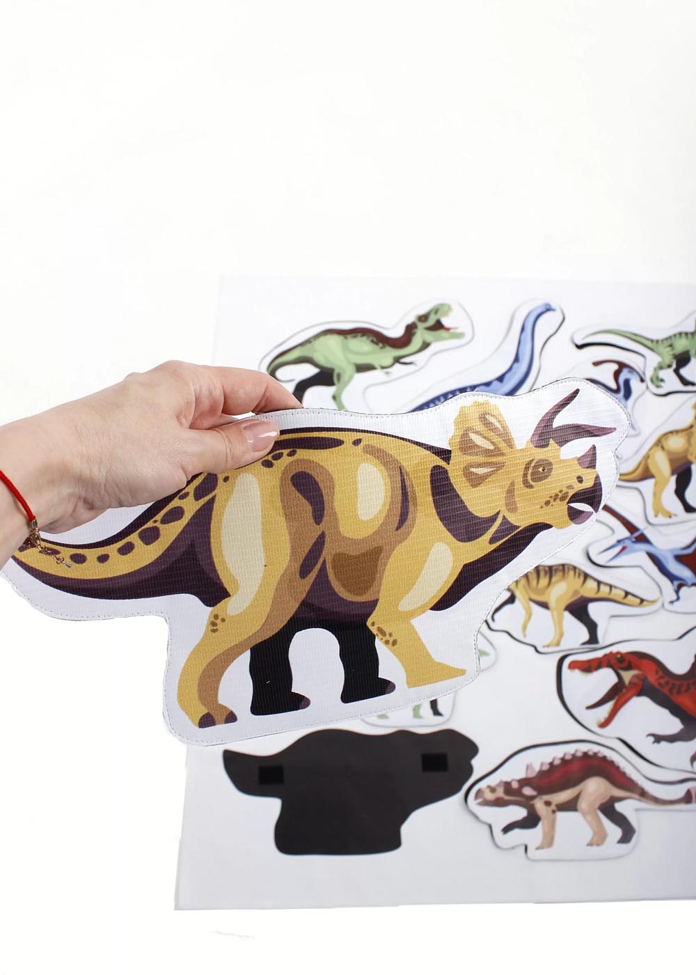 Реквизит Найди тень Динозавра представляет собой интерактивную игру для детей, включающую полотно с тенями и 12 картинок динозавров.Полотно выполнено из обработанной баннерной ткани, что обеспечивает его прочность и долговечность. Размер полотна составляет 100 см в длину и 100 см в ширину, что делает его достаточно крупным для удобства игры. Картинки динозавров изготовлены из баннерной ткани на плотной основе, обеспечивая им прочность и стабильность.