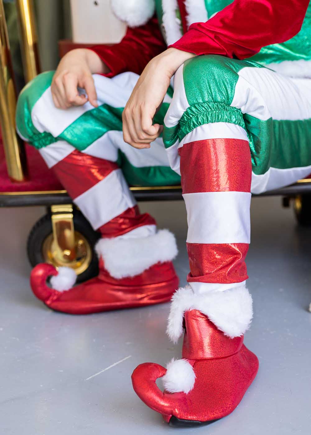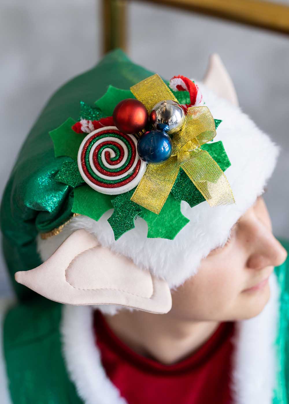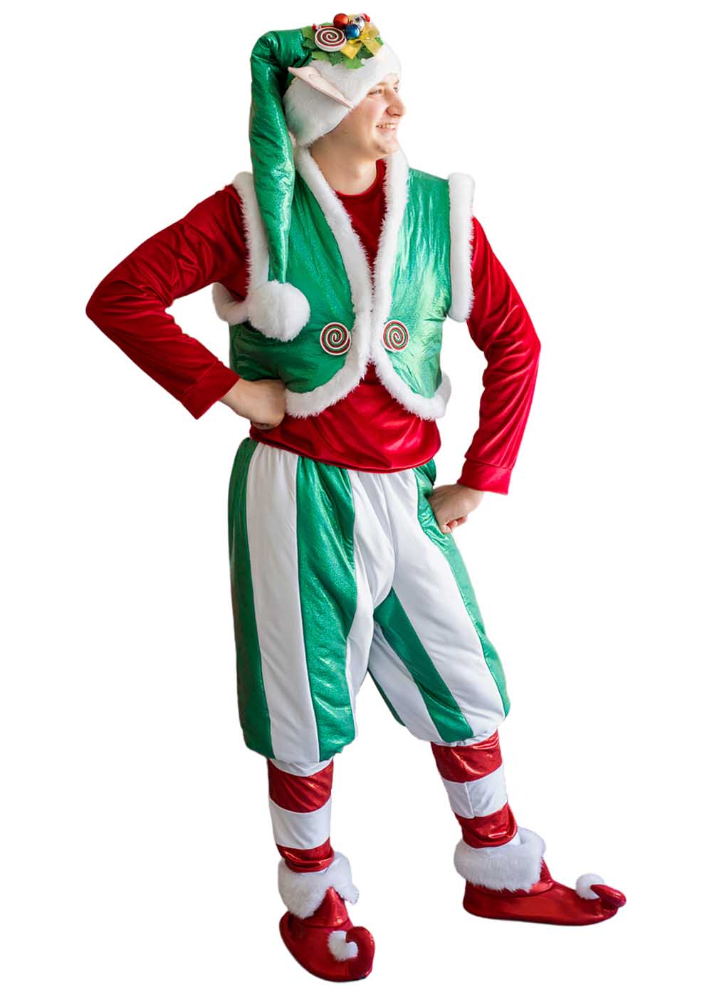 Новогодний костюм Эльфа мужской включает в себя кофту, штаны, жилетку, головной убор и обувь. Костюм выполнен в праздничных цветах: зеленом и красном. Кофта красного цвета добавляет яркости и праздничного настроения. Зеленая жилетка и штаны с белыми полосами придают костюму элегантность и создают новогодний дух. Зеленый головной убор и красная обувь завершают образ, делая его полным и гармоничным.