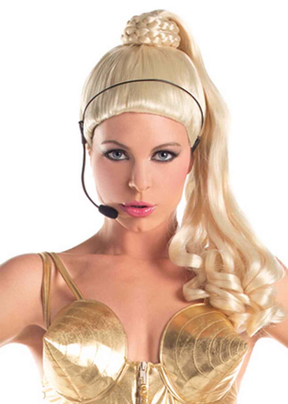 Парик поп-звезды создан для тех, кто мечтает о великолепной сценической презентации. Волосы парика уложены и заплетены в стильный и модный образ. Сетчатая шапка обеспечивает комфортную и надежную посадку. Высокий хвост, закрученный в клубок кос, идеально дополняет образ, придавая яркий и запоминающийся вид. Спадающие волосы обрамляют лицо, создавая элегантные и женственные локоны. Кроме того, парик оснащен нефункциональной гарнитурой с микрофоном и шнуром, что придает образу аутентичность и стилизованность.