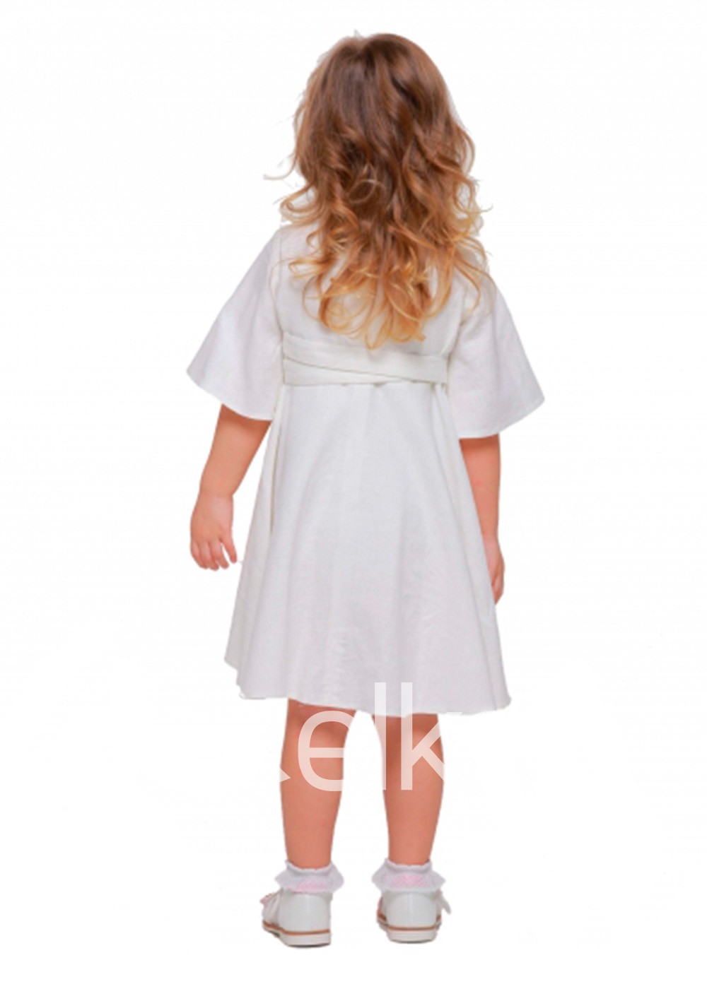Данная модель имеет свободный крой, короткие рукава регланы и среднюю длину - идеальное сочетание, чтобы девочка чувствовала себя комфортно. На спине есть потайная пуговица застежка с внутренней стороны, а также в комплекте идет тонкий белый поясок.