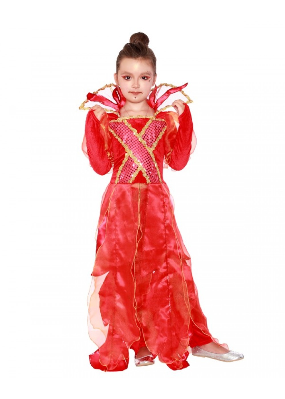 Костюм Феникс детский состоит из костюма с брюками и головного убора. Основные ткани - велюр, атлас, пайеточная ткань высокого качества. Верх костюма выполнен из велюра, имеется вставка пайеточной ткани, обшитой золотой тесьмой. На плечах имеются вставки фатина. Высокий ворот выполнен из сетки, обшитой тесьмой, добавляет образу волшебности. Велюровые штаны удобного фасона поверх покрыты атласом и фатином в форме перьев.