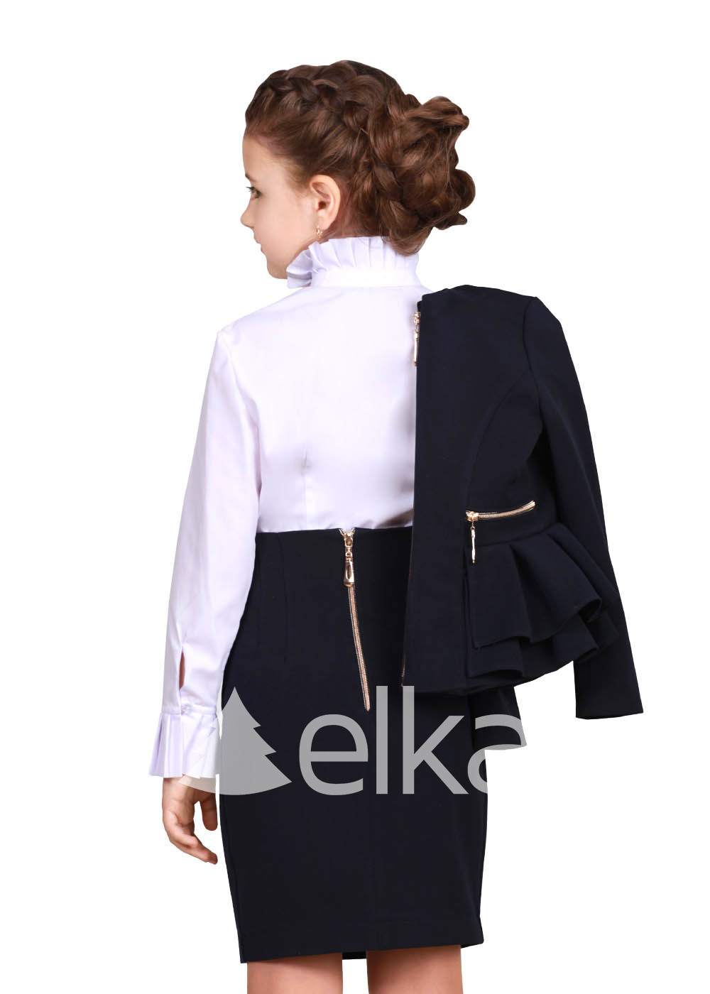 Особенность данной модели в приталенном фасоне и изящном акценте в виде рюш. Стоит отметить, что пиджак будет уместен не только в школе, но и в повседневной жизни девочки, а также на торжествах. Темно - синий пиджак из новой коллекции отличается стильным дизайном, усовершенствованным фасоном и высочайшим качеством пошива и тканей.