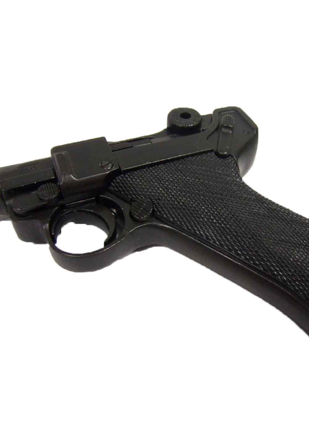 Это воспроизведение пистолета, изготовленного из металла с пластиковыми рукоятками, с имитацией механизма зарядки и стрельбы, а также с съемным магазином. Пистолет Parabellum, известный также как модель 1908 (P08) или Люгер, является полуавтоматическим оружием, работающим за счет отдачи, которое выжило после ограничений Версальского договора. Он использует внутренний слайдер, управляемый артикулированным механизмом, в отличие от внешнего слайдера, характерного для большинства других полуавтоматических пистолетов.