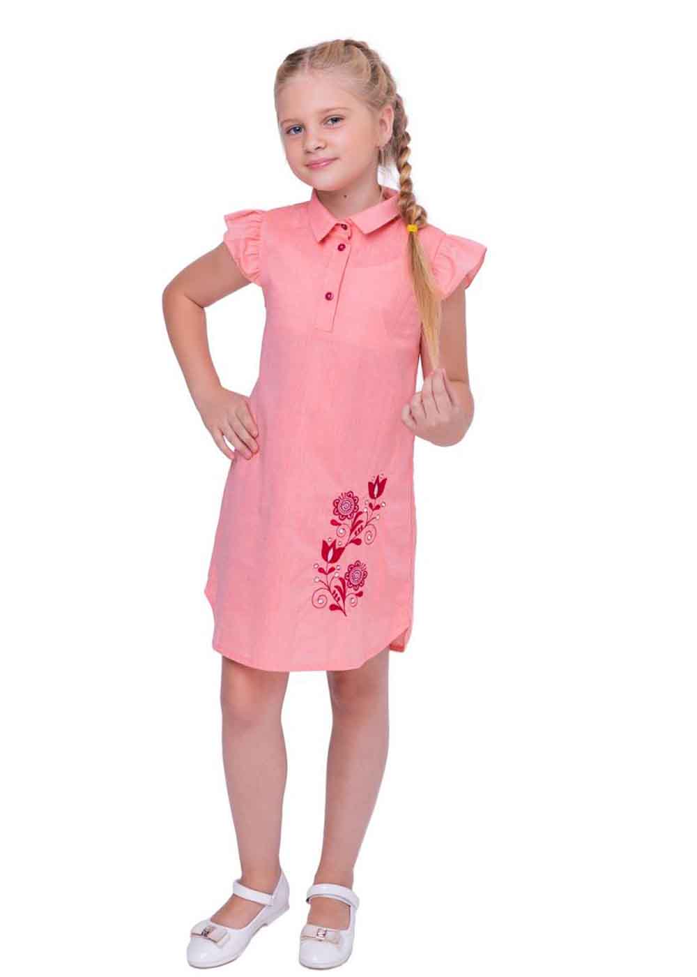 Платье для девочки Агния представлена в розовом цвете и выполнена из басиста хорошего качества. Платье прямого фасона с коротким рукавом. Спереди декорировано старинной цветочной вышивкой.