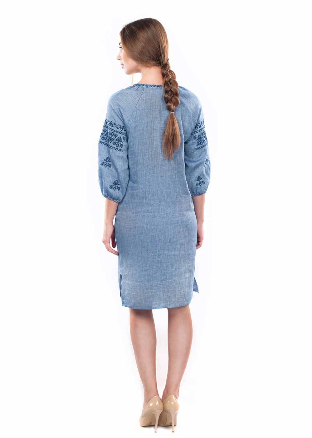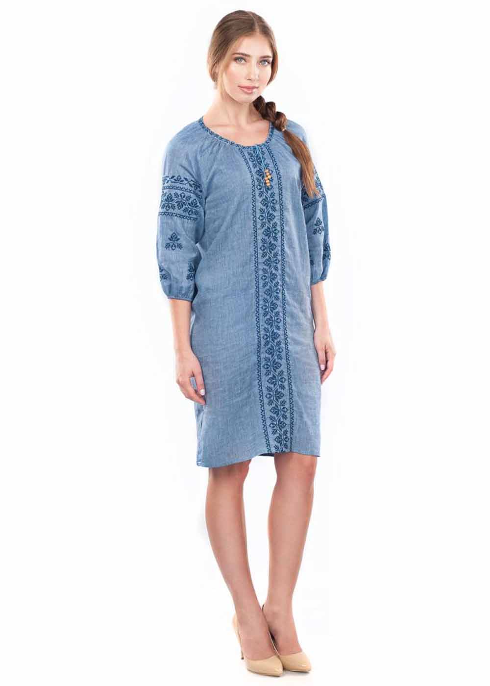 Платье вышиванка Сокальское выполнено в синем цвете из натуральной льняной ткани высокого качества. Представляется в нескольких размерах. Горловина овальной формы подчеркивает линию плеч и ключицу, имеет V-образный вырез. Длина рукава ¾. Платье украшено старинной аутентичной вышивкой нитью синего цвета. Внизу платья по бокам расположены небольшие вырезы.