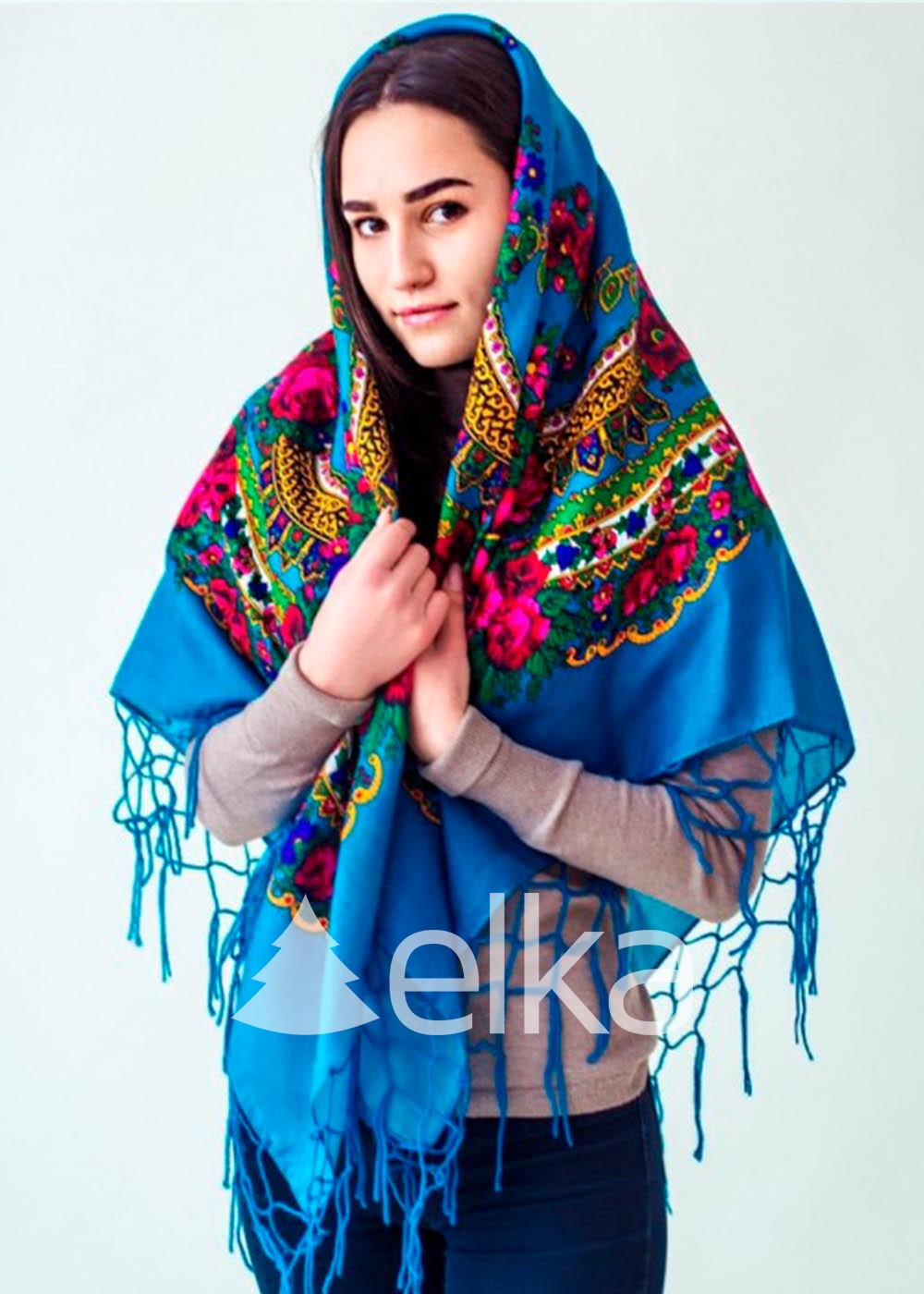 Размер платка 125 см * 125 см. Платок Украинский голубой выполнен из качественного акрила. Женский национальный платок украшен фольклорным узором в виде ярких цветов с традиционным орнаментом. Сетчатая бахрома по краю платка служит дополнительным украшением.