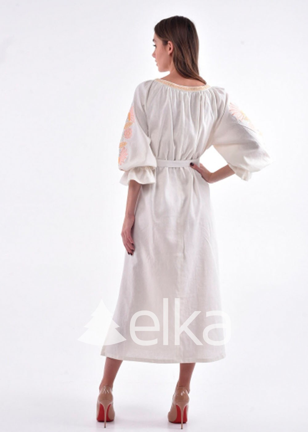 Эффектное платье в белом цвете. Светлый оттенок ткани в симбиозе с золотой вышивкой образует интересное слияние красок. Пышные рукава три четверти собраны в рюш и подчеркивают хрупкость женских рук, а манжеты на резинках позволяют свободно двигаться. Цветы символизируют здоровье, гармонию и женское начало. В давние времена одежду с подобной вышивкой девушки носили для того, чтобы обрести или сохранить свое счастье.