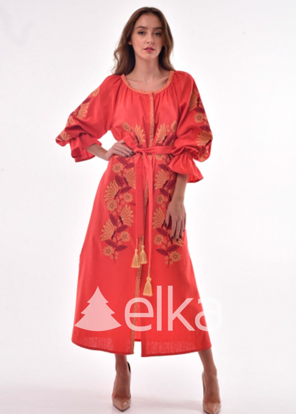 Платье транслирует уверенность в себе, но в то же время как бы намекает на утонченную натуру своей обладательницы. Золотая цветочная вышивка украшает платье по всей длине. Широкие рукава собраны в рюш, чтобы подчеркнуть изящность рук. В комплекте идет поясок с игривыми золотыми кисточками. Сиять в этом платье очень просто: достаточно только надеть его, улыбнуться и весь мир у Ваших ног.