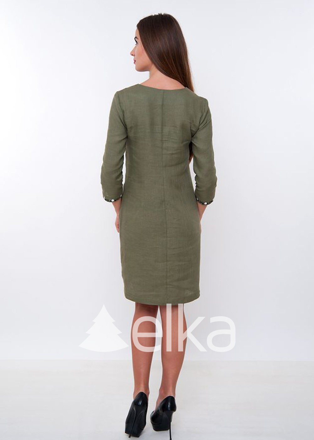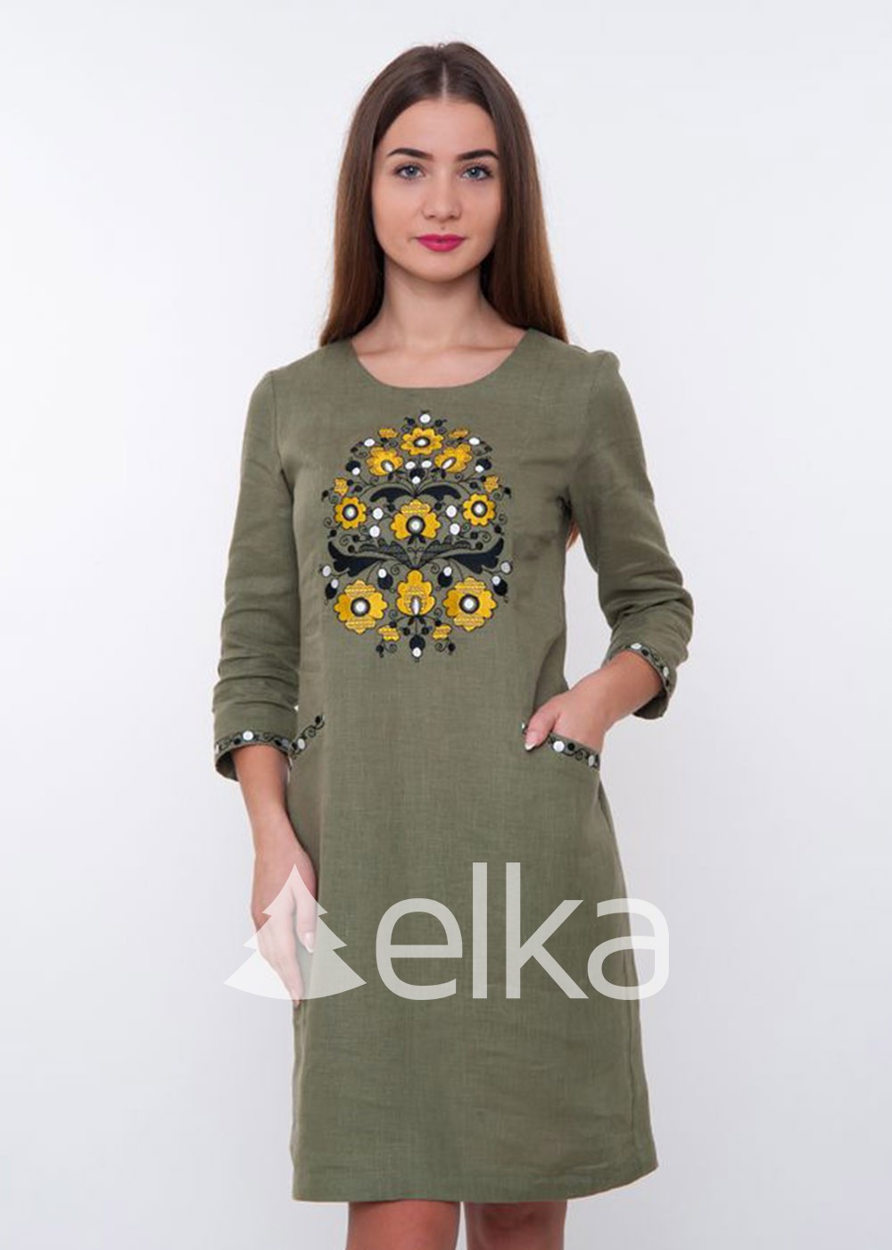 Платье вышиванка оливковое выполнено из 100%-го льна.