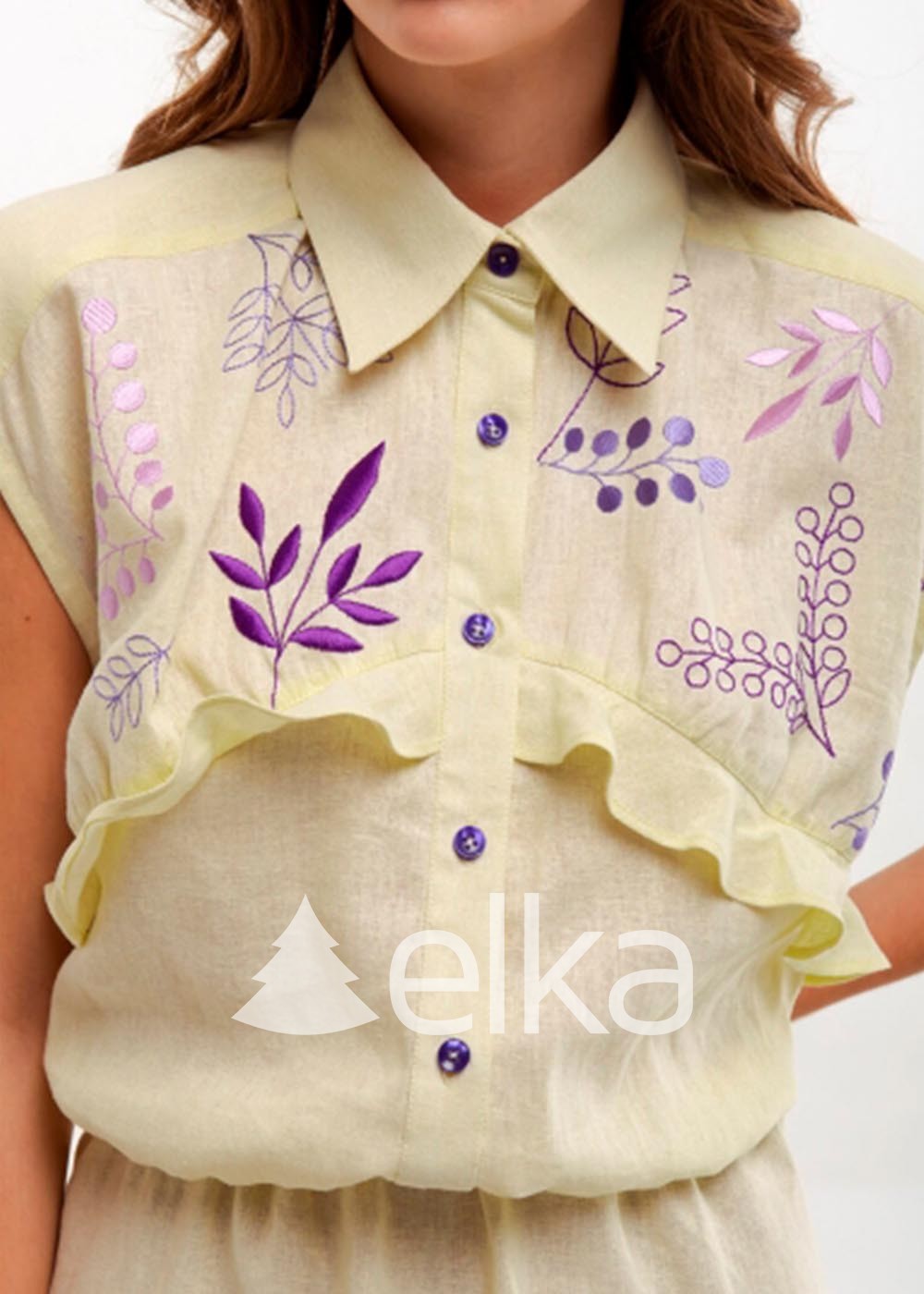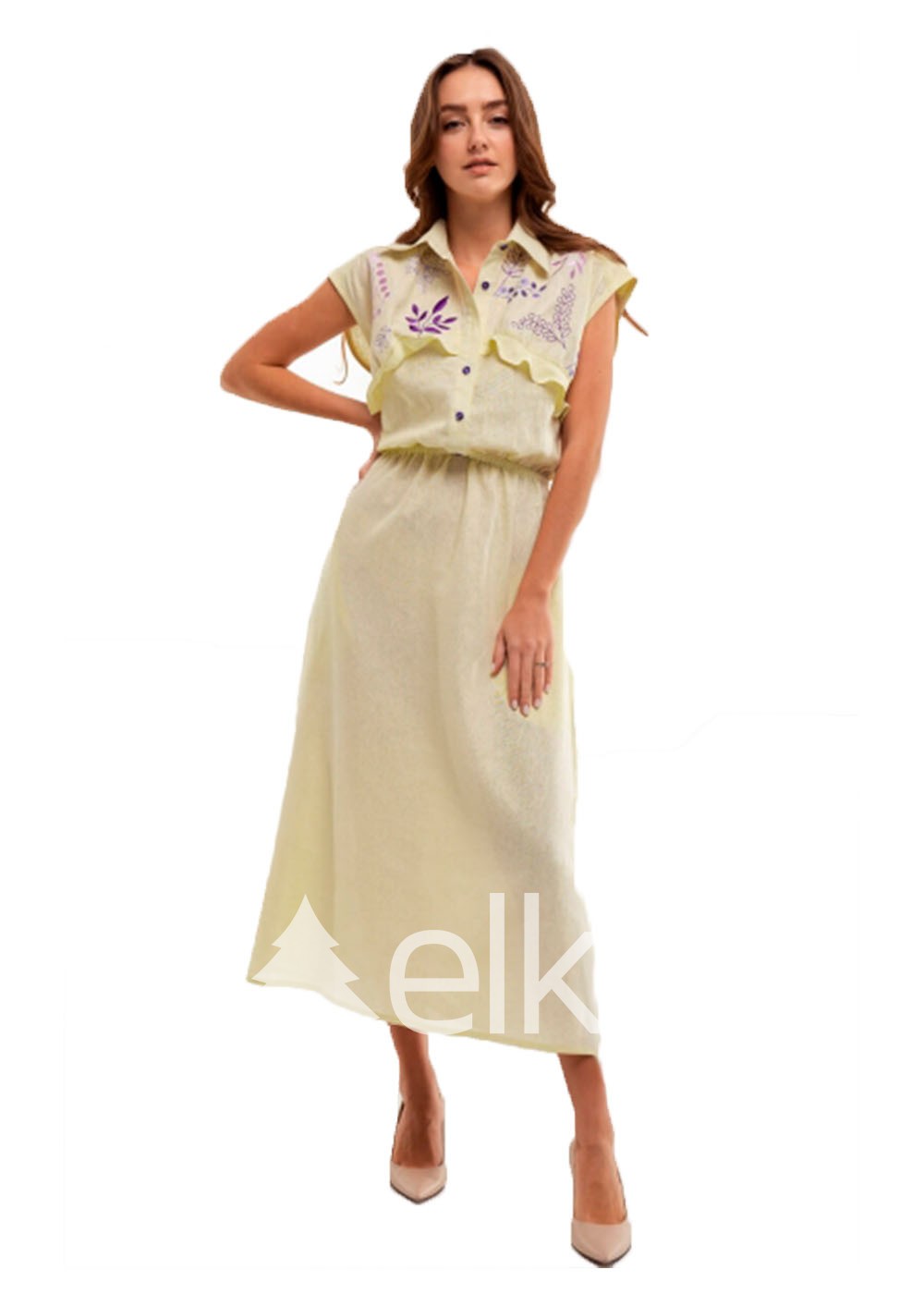Желтое женское вышитое платье из высококачественных материалов. Необычные узоры фиолетового цвета расположись в верхней части платья. Данная модель с короткими рукавами станет незаменимой вещью летнего гардероба. Ткань пропускает воздух и не деформируется после стирки. А-силуэт платья с выраженной линией талии удачно подчеркнет любой тип фигуры.