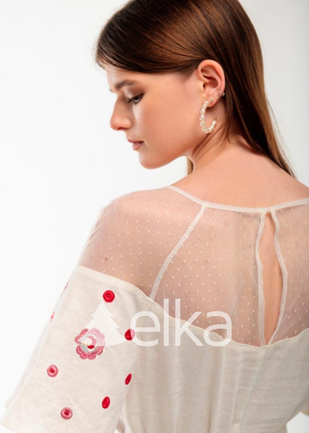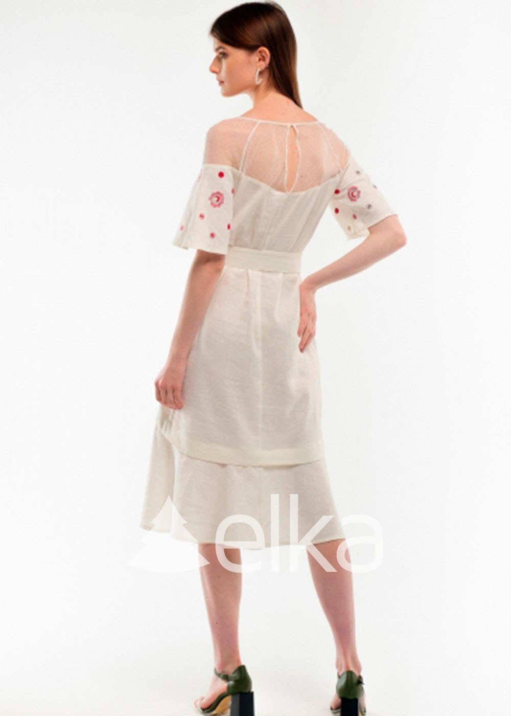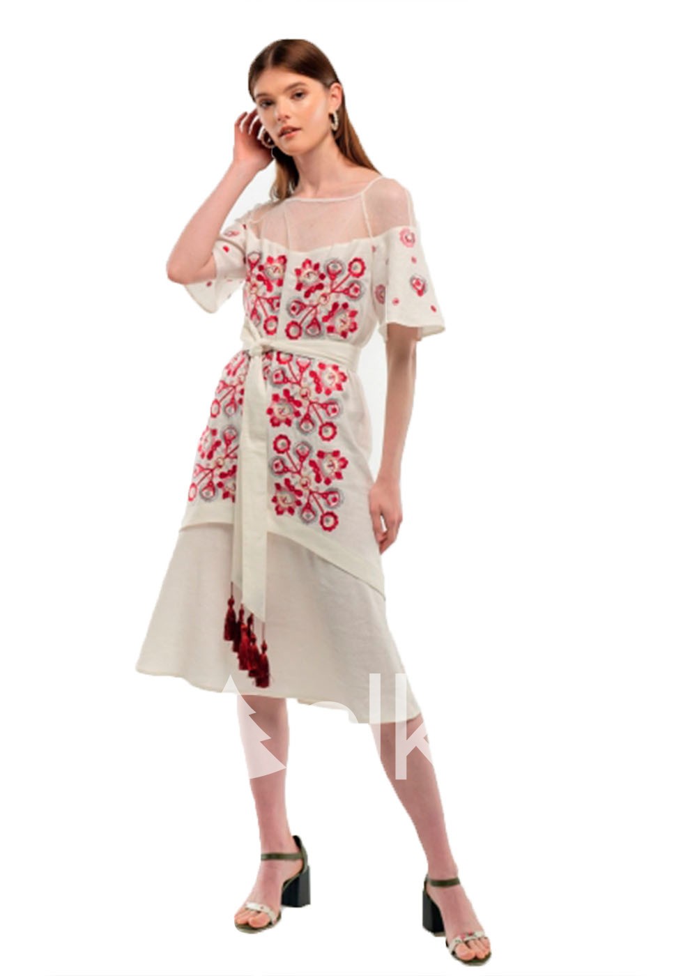 Такая весьма яркая, броская вышивка характерна для южной части Украины. Растительный орнамент символизирует красоту, любовь и торжество жизни. Верхняя часть рукава и кокетка выполнены из прозрачной сетки, что привносит в вышитое платье свою изюминку. По низу идет рюша. Платье укомплектовано поясом, которым поможет сделать акцент на талии.