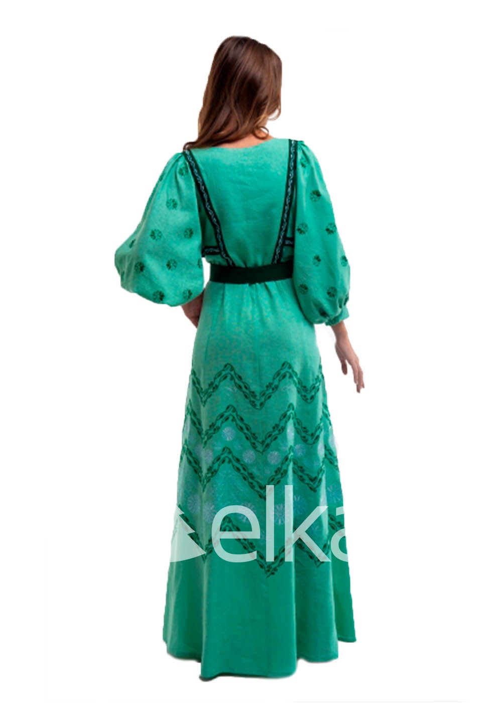 Вышитое женское платье актуального зеленого цвета из 100%-го льна. В комплекте идет длинный удобный пояс, который подчеркнет изящный силуэт. Данная модель хорошо садится по фигуре, а широкие рукава позволяют свободно двигаться. Платье однозначно привлечет к себе внимание на любом празднике.
