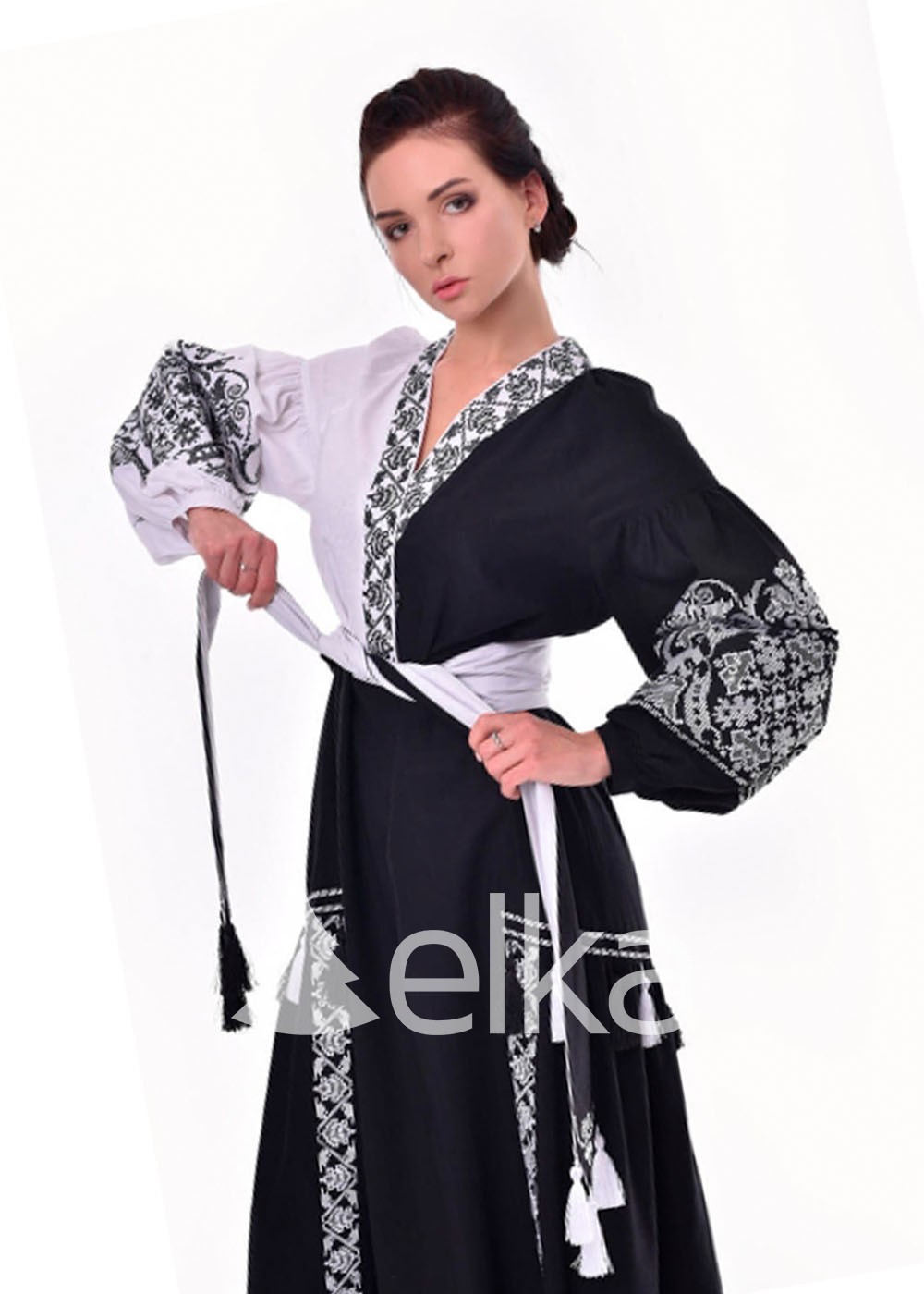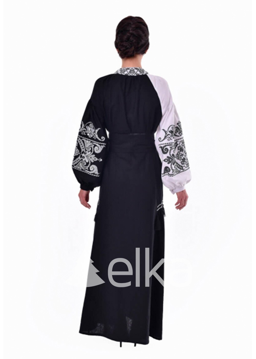 Льняное платье выполнено в восточном стиле. В данной модели сошлись лучшие образцы традиционных узоров и современные тенденции. Монохромная вышивка белым по черному и черным по белому смотрится элегантно и дорого. В комплекте к платью идет удобный пояс, которым можно запросто сделать акцент на талии и красиво подчеркнуть свою фигуру.