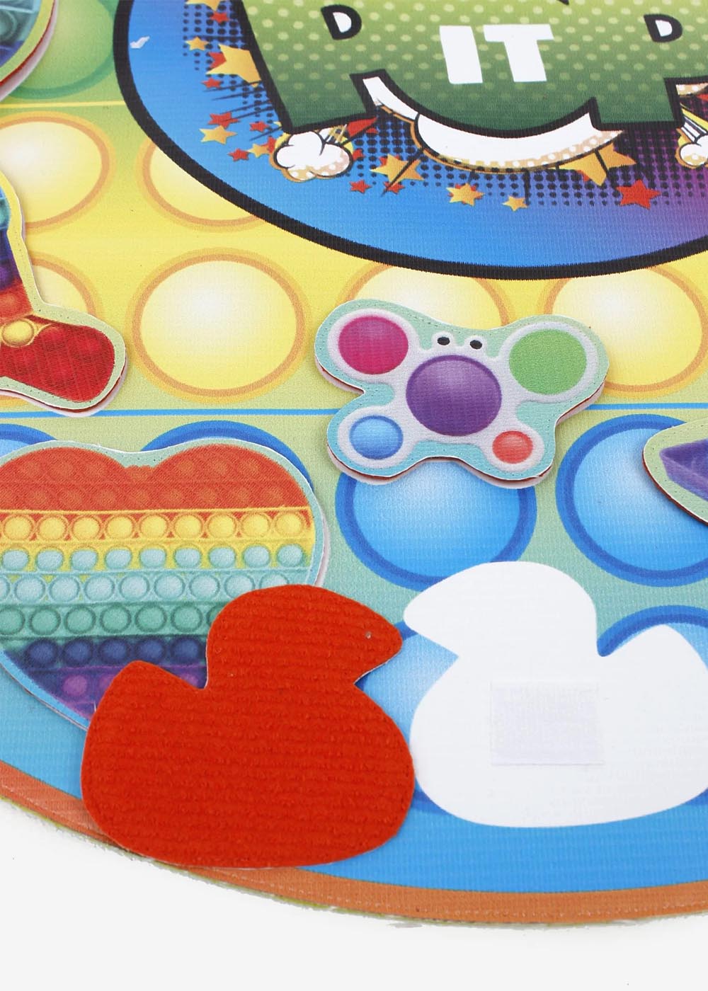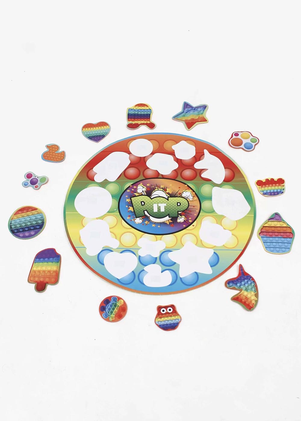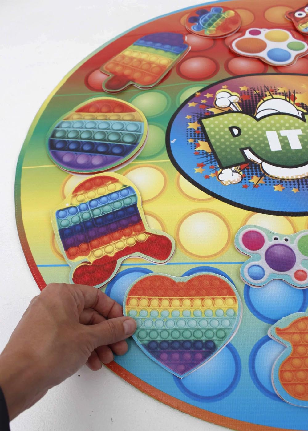 Реквизит Поп ит Тени представляет собой игровой набор, состоящий из круглого полотна с тенями и 13 картинок в виде поп-итов разной формы. Задачей детей является быстро найти место для каждого поп-ита на полотне, соответствующее его форме.