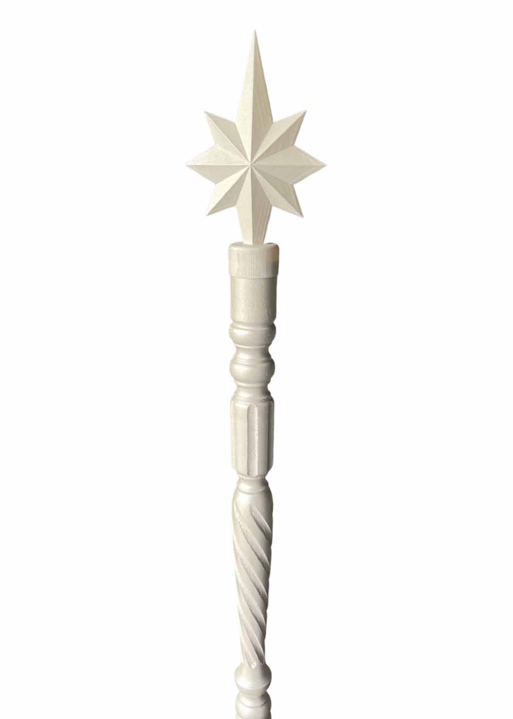 Посох для деда Мороза, Санты, Святого Николая выполнен из натурального дерева. Аксессуар украшен серебрянной звездой. Посох просто транспортировать, что немаловажно для актеров (аксессуар быстро разбирается на 2 части). Для производства посоха использовались высококачественные материалы и декор.
