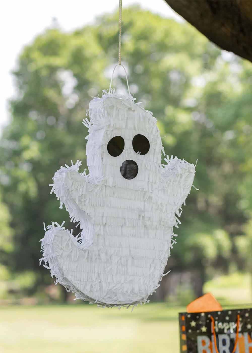 Пиньята в форме привидения добавит в вашу вечеринку призрачное веселье. С высотой 53 см, шириной 36 см и толщиной 10 см, пиньята представляет собой идеальное украшение для Хэллоуина или тематической вечеринки. Пластиковая петля на макушке облегчает подвешивание. Чтобы наполнить пиньяту лакомствами, используйте закрытое отверстие сверху, которое легко можно заклеить папиросной бумагой. Тело украшено папиросной бумагой с бахромой, а для создания лица достаточно приклеить бумажные кружочки для глаз и рта.