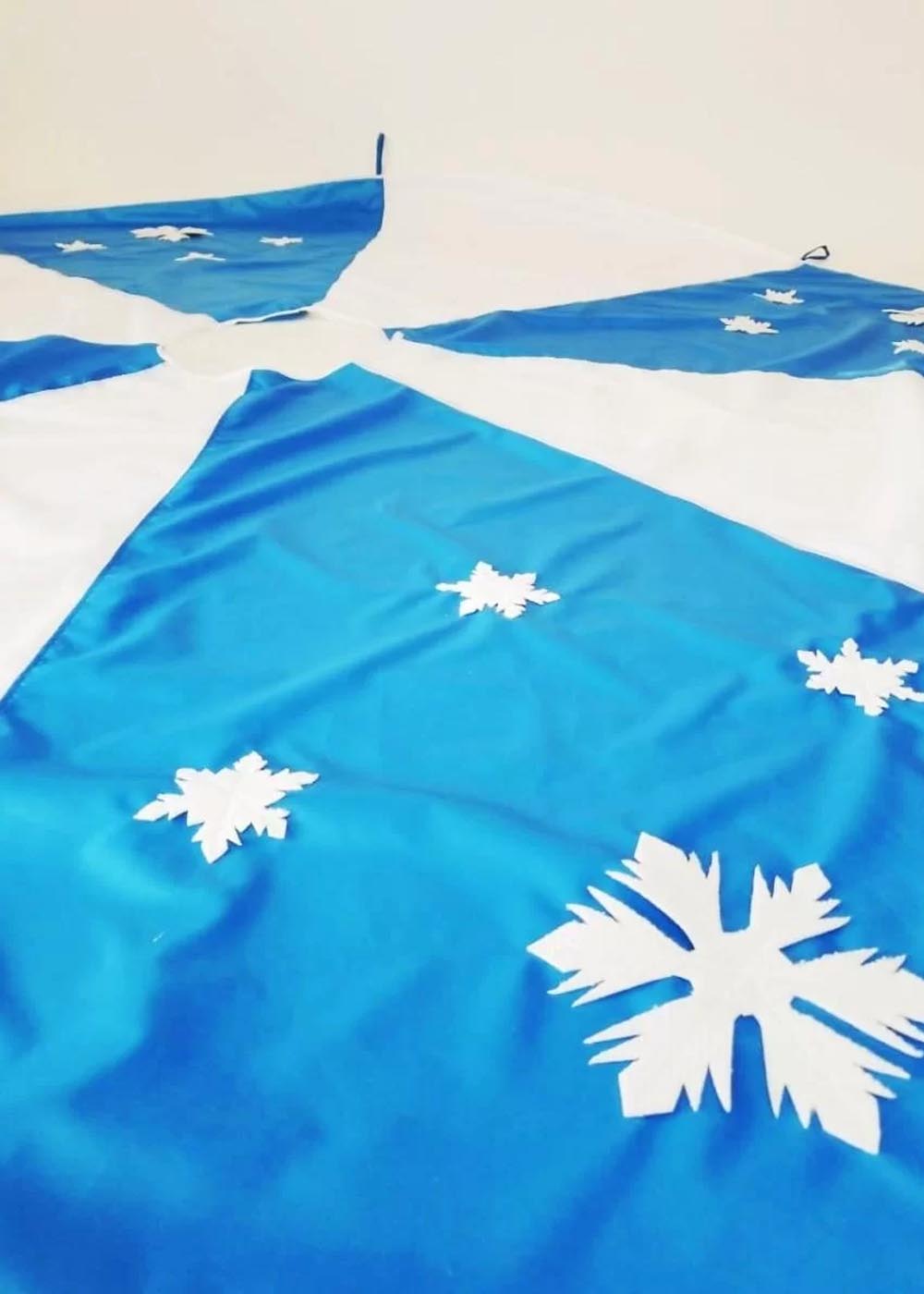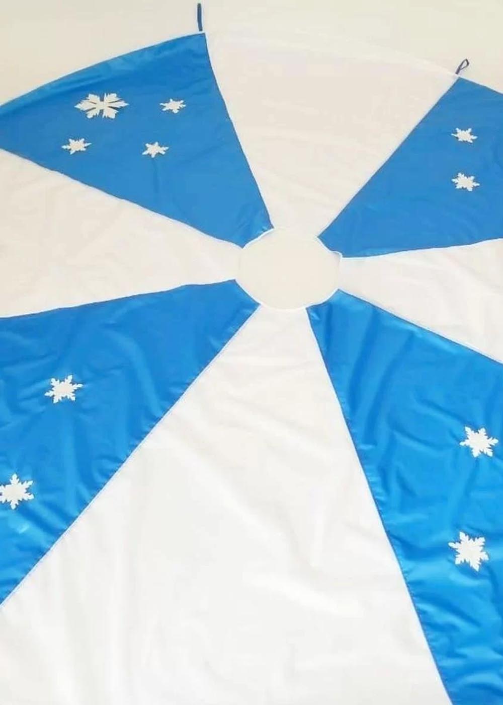 Реквизит Парашют для новогодних мероприятий выполнен из оксфорда и ковролина. Его диаметр составляет 3 метра. Парашют яркий и большой, украшенный снежинками и выполнен в нежной голубой гамме, что делает его прекрасным дополнением к вашей коллекции зимнего реквизита.