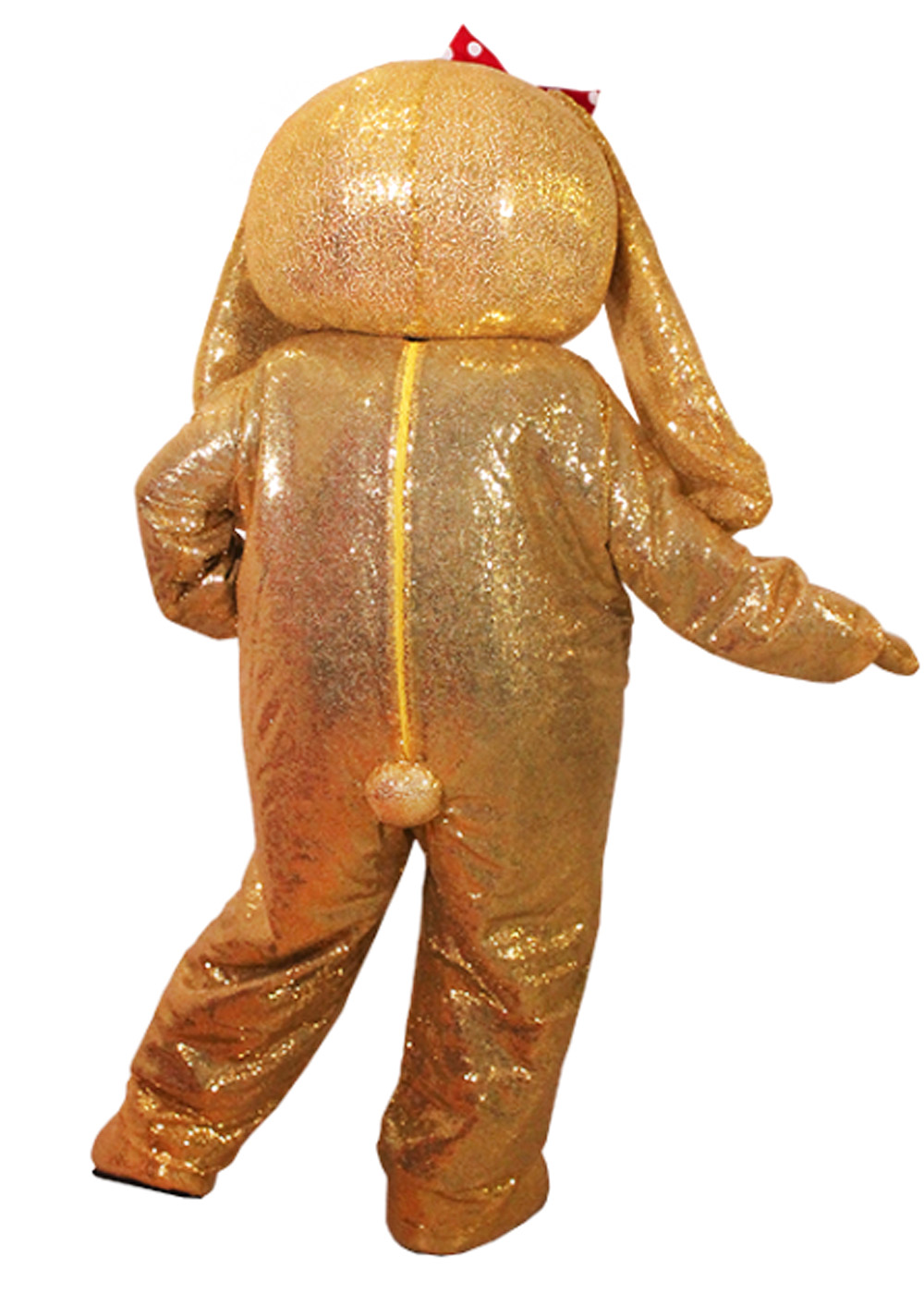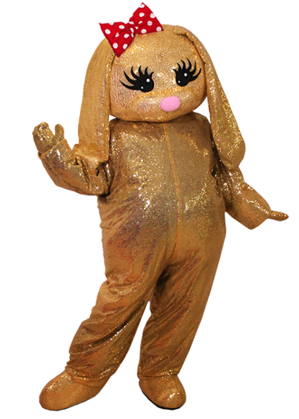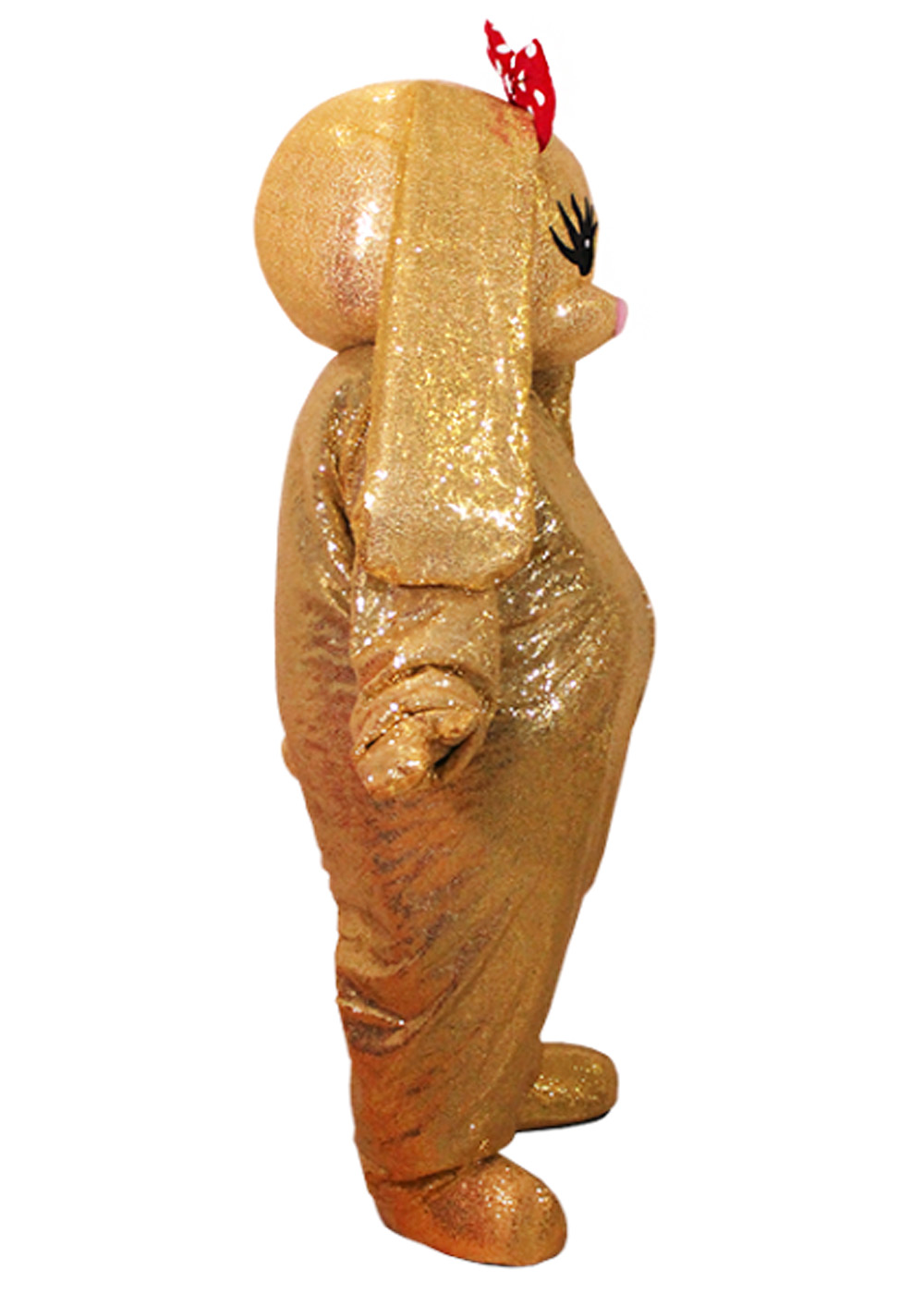 Ростовой костюм золотая Зайка - это воплощение изысканности и элегантности, созданный для вдохновения и веселья. Ростовая кукла Зайка представляет собой идеальный выбор для особых мероприятий и праздников. Голова куклы имеет основу из поролона, сверху она декорирована блестящими пайетками. Глазки Зайки сделаны из сетчатого материала, обеспечивая прекрасную видимость. Для создания полного образа комбинезон изготовлен из объемного жилета, покрытого пайетками. Комплект также включает перчатки и обувь на прорезиненной подошве.