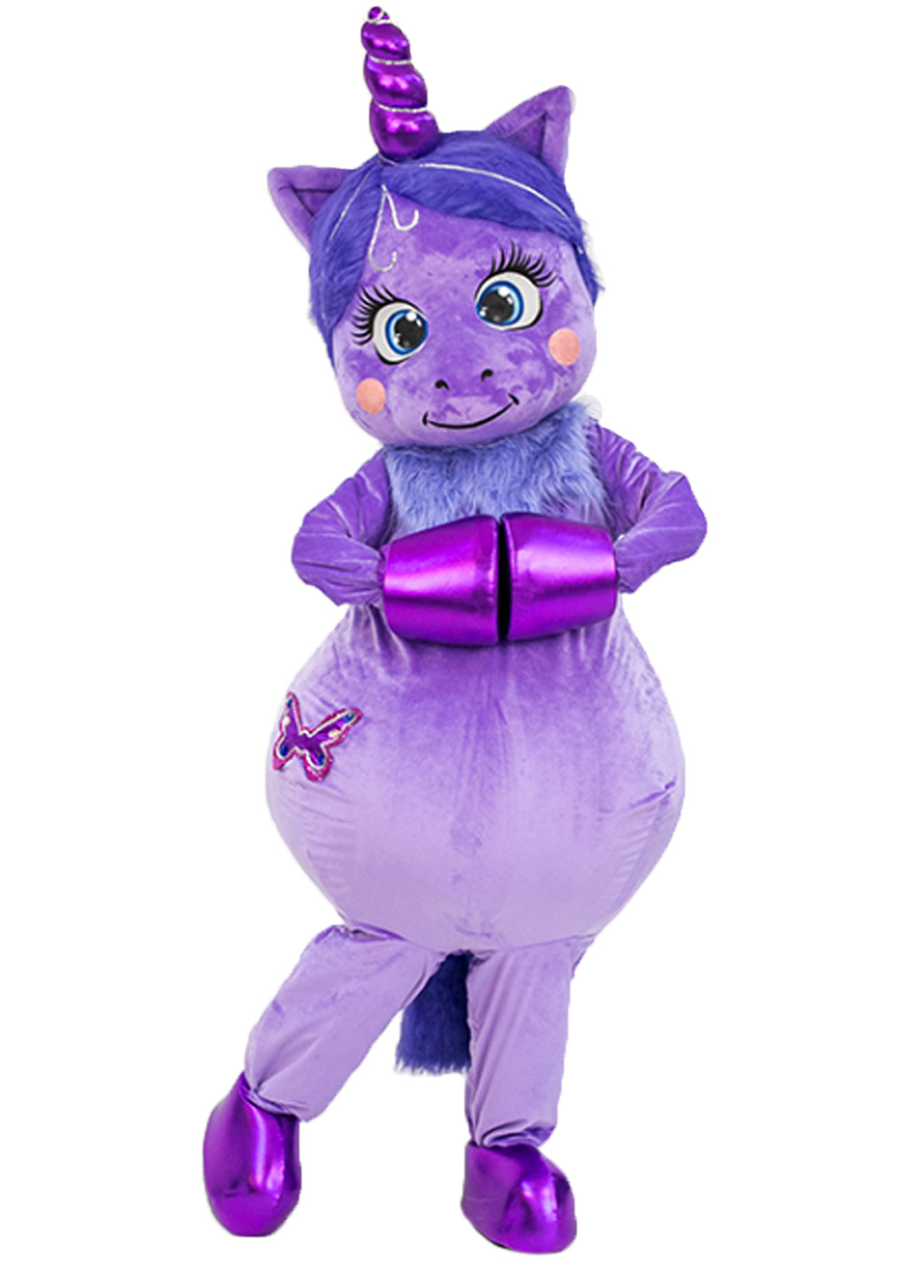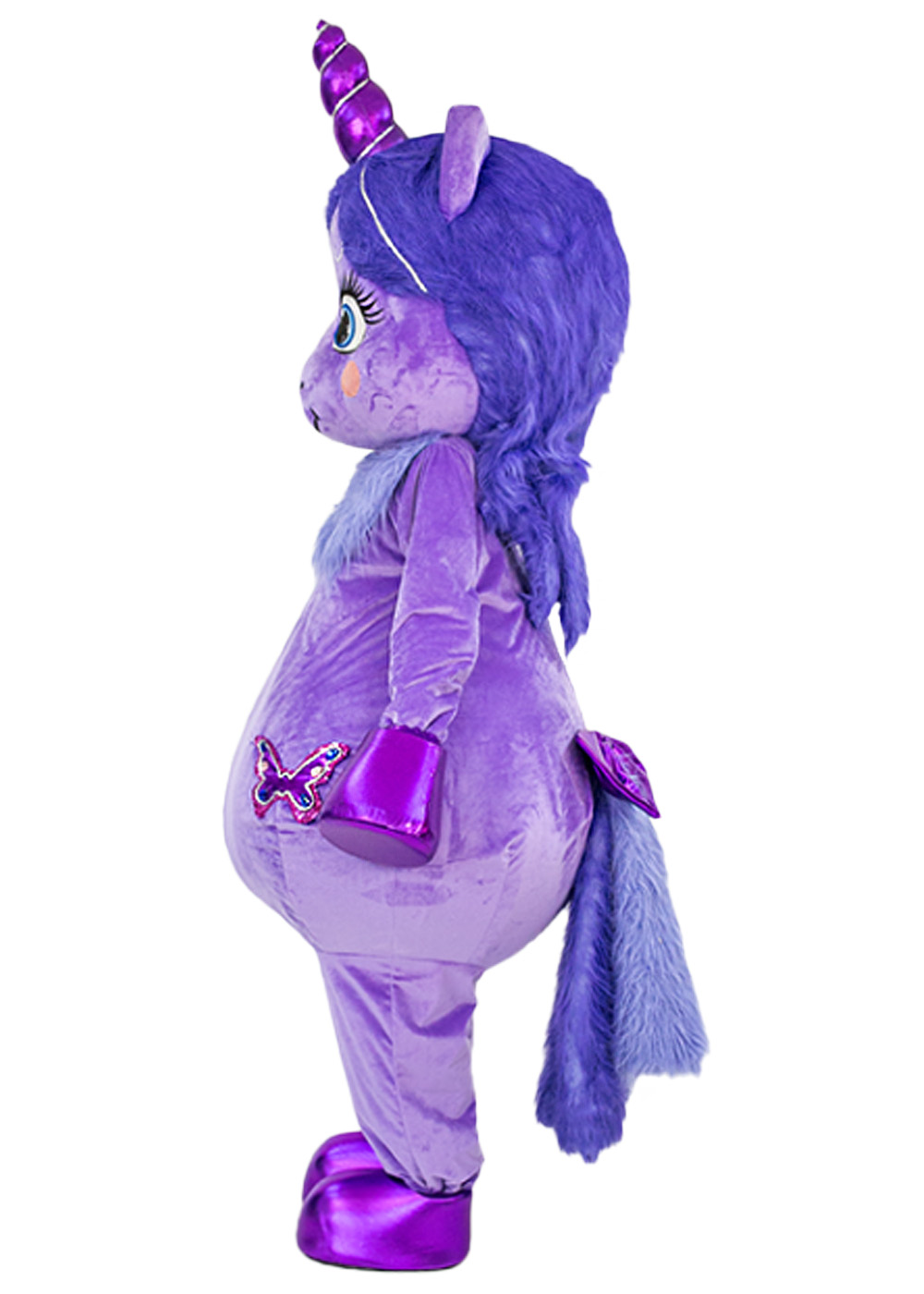 Ростовая кукла Юникорн волшебного цвета — символ красоты и загадочности! Голова с поролоновым каркасом, обтянутым мехом, с сетчатыми глазами и смотровой областью, создает очаровательный образ. Туловище этого костюма Единорожки выполнено из фиолетового меха в виде комбинезона, с объемным жилетом, а также в комплекте пара перчаток и пара обуви.