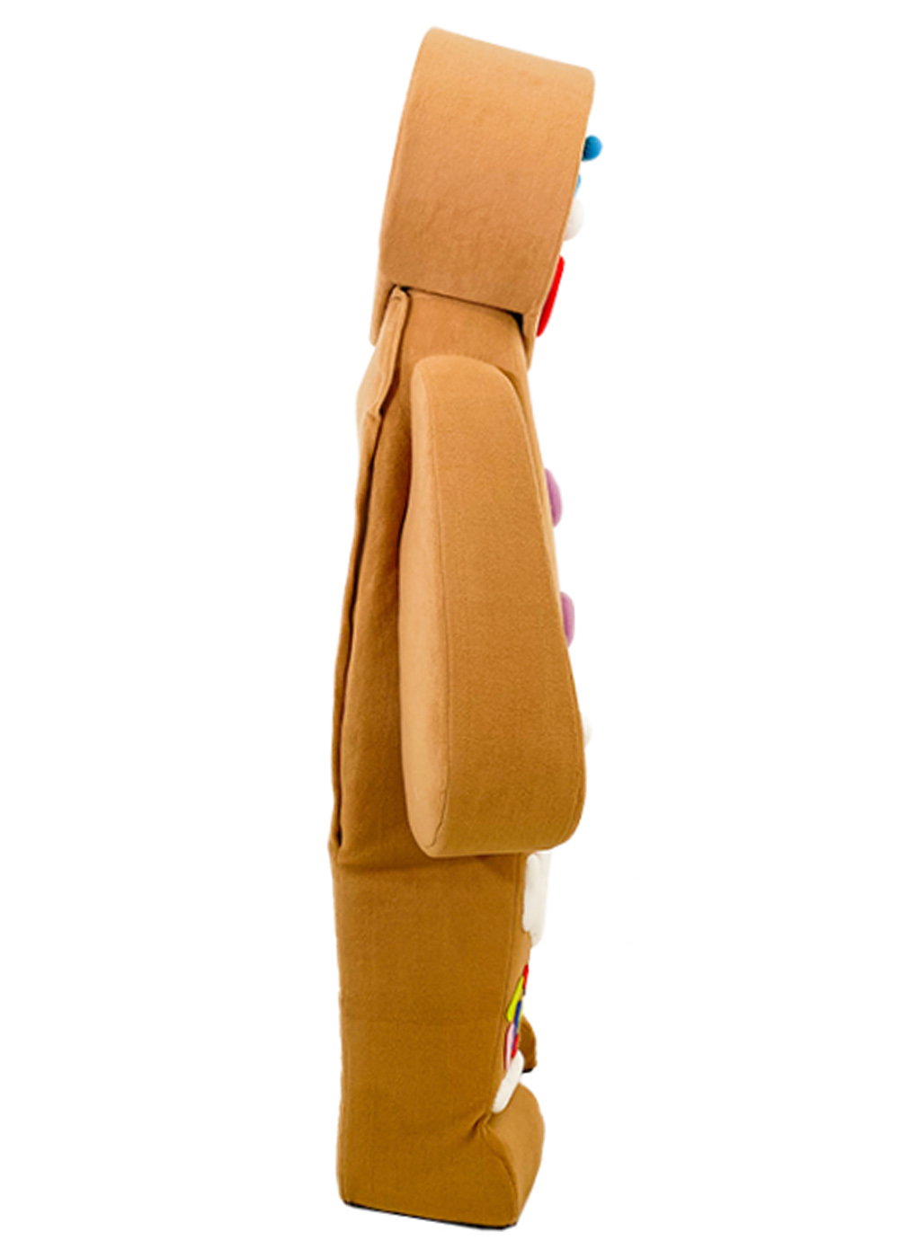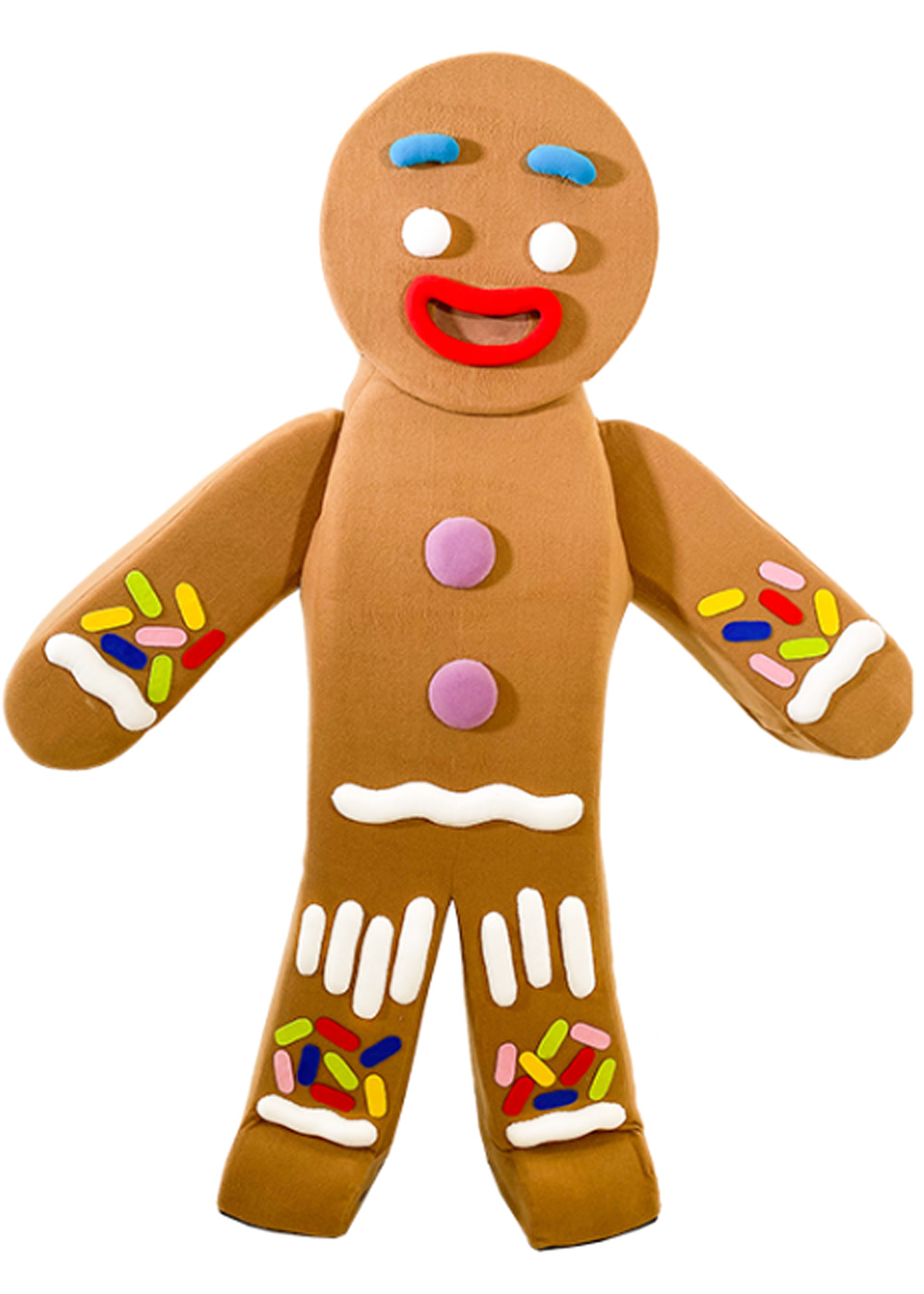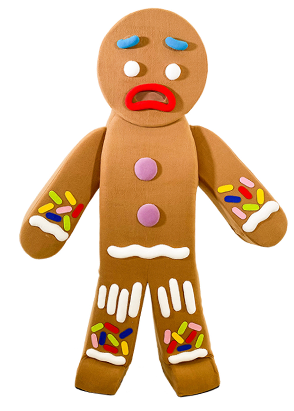 Ростовая кукла Пряник из мультфильма "Шрек" является веселым и ярким персонажем. Голова куклы имеет поролоновый каркас с изолоновыми вставками, обтянутыми мягким флисом. Сетчатые глаза и смотровая область во рту придают выразительности маске. Туловище куклы также выполнено из поролонового каркаса, обтянутого флисом с объемными декоративными элементами и нашивками, что создает забавный вид персонажа. Этот костюм прекрасно подходит для разных праздничных мероприятий, где дети могут наслаждаться ярким и интересным образом Пряника из "Шрека"