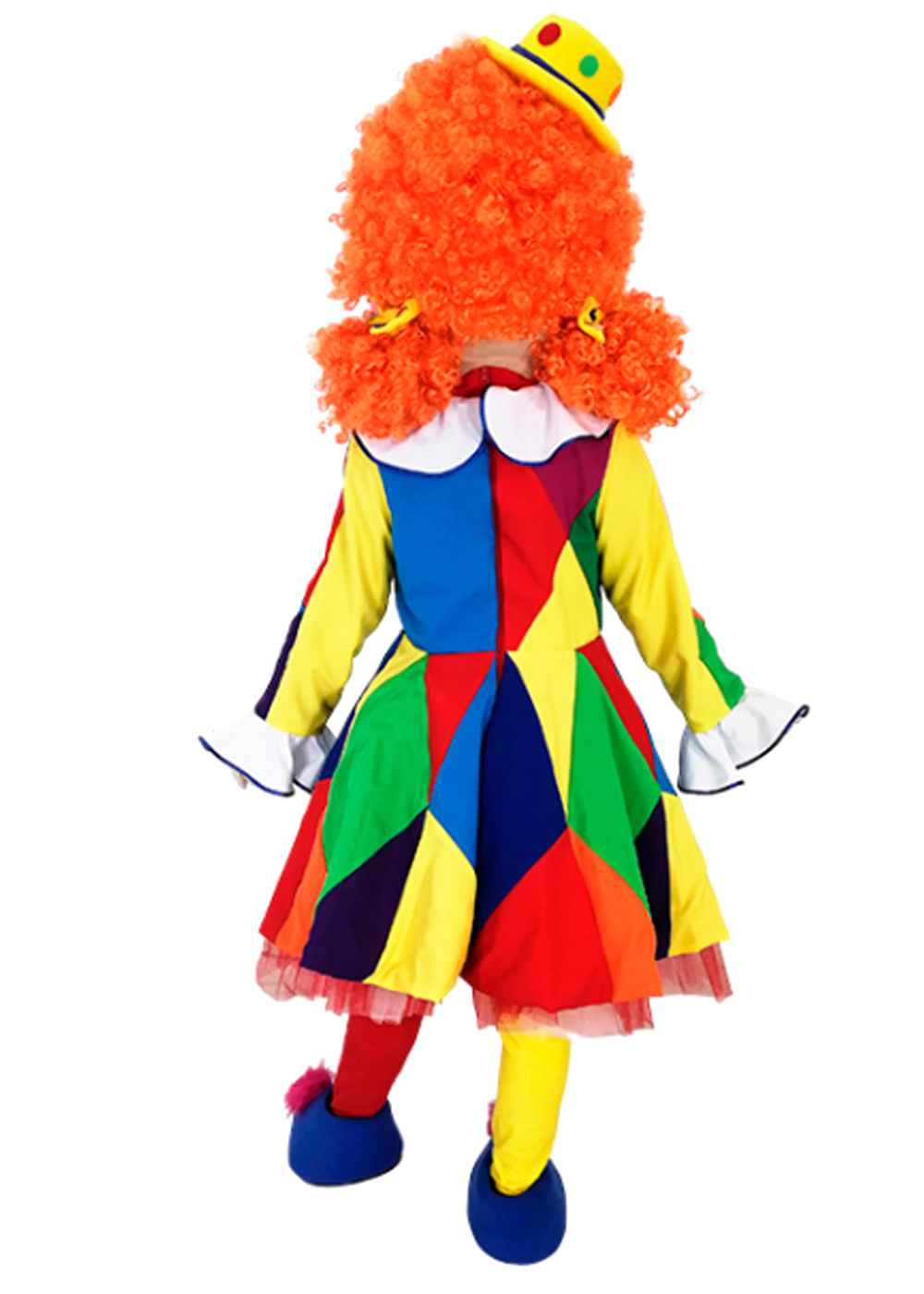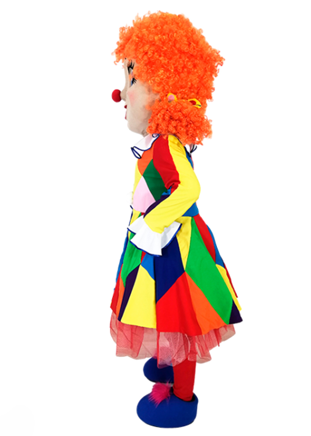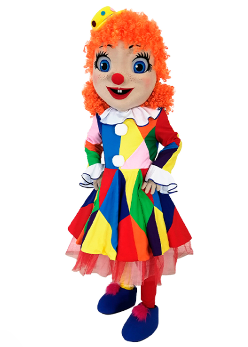 Ростовой костюм Клоунессы воплощает яркий образ циркового персонажа. Верхняя часть костюма - голова, имеет поролоновый корпус, покрытый мягким флисом, с сетчатыми глазами для хорошей видимости и дополнительными вентиляционными отверстиями в области рта. На голове также имеются яркие искусственные волосы, придающие образу дополнительную выразительность. Основная часть костюма включает в себя платье, лосины, перчатки и обувь на прорезиненной подошве для удобства и безопасности движения.