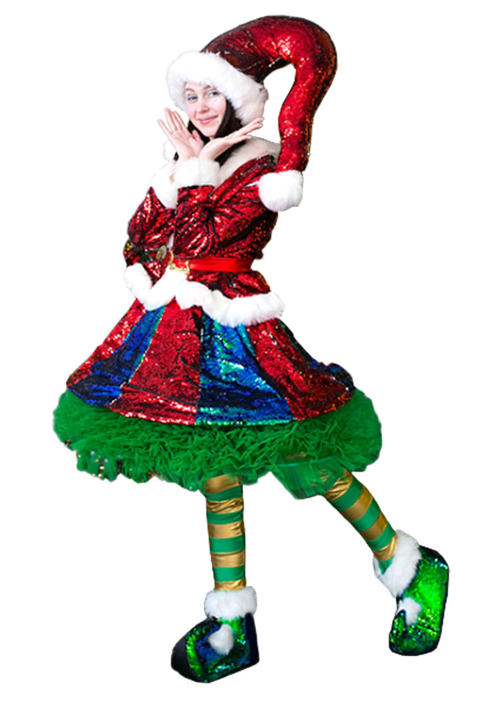 Карнавальный костюм Рождественский Эльф это великолепный наряд,который включает в себя платье, украшенное блестящими пайетками и фатиновыми вставками, а также подъюбник для создания объема. Шубка из пайеток и меха добавляет шарма и тепла, а пояс подчеркивает талию. Лосины из мягкого трикотажа обеспечат комфортное движение. Завершает образ стильный колпак из блестящих пайеток. В комплекте также идет пара обуви с поролонового каркаса и обтянутый тканью, на полиуретановой подошве.