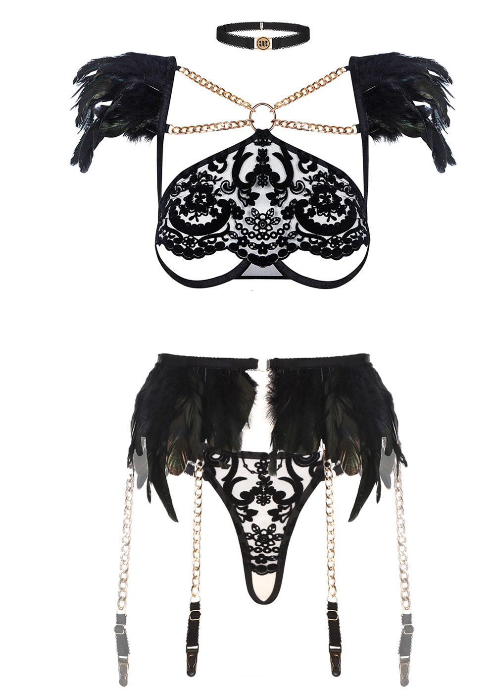 Комплект нижнего белья Черный ангел прославляет женственность и чувственность, совмещая элегантность и обольстительность. Этот потрясающий костюм разработан для того, чтобы вы чувствовали себя уверенно и привлекательно, изготовлен из лучших материалов, включая нежное кружево, создающее тонкий контраст с черной основой. Бюстгальтер на косточках обеспечивает поддержку, а регулируемые бретели обеспечивают удобную посадку. Стринги с кружевными деталями и эластичным поясом идеально дополняют комплект. Этот набор нижнего белья идеально подходит для особых случаев или для добавления нотки гламура в вашу повседневную коллекцию белья.