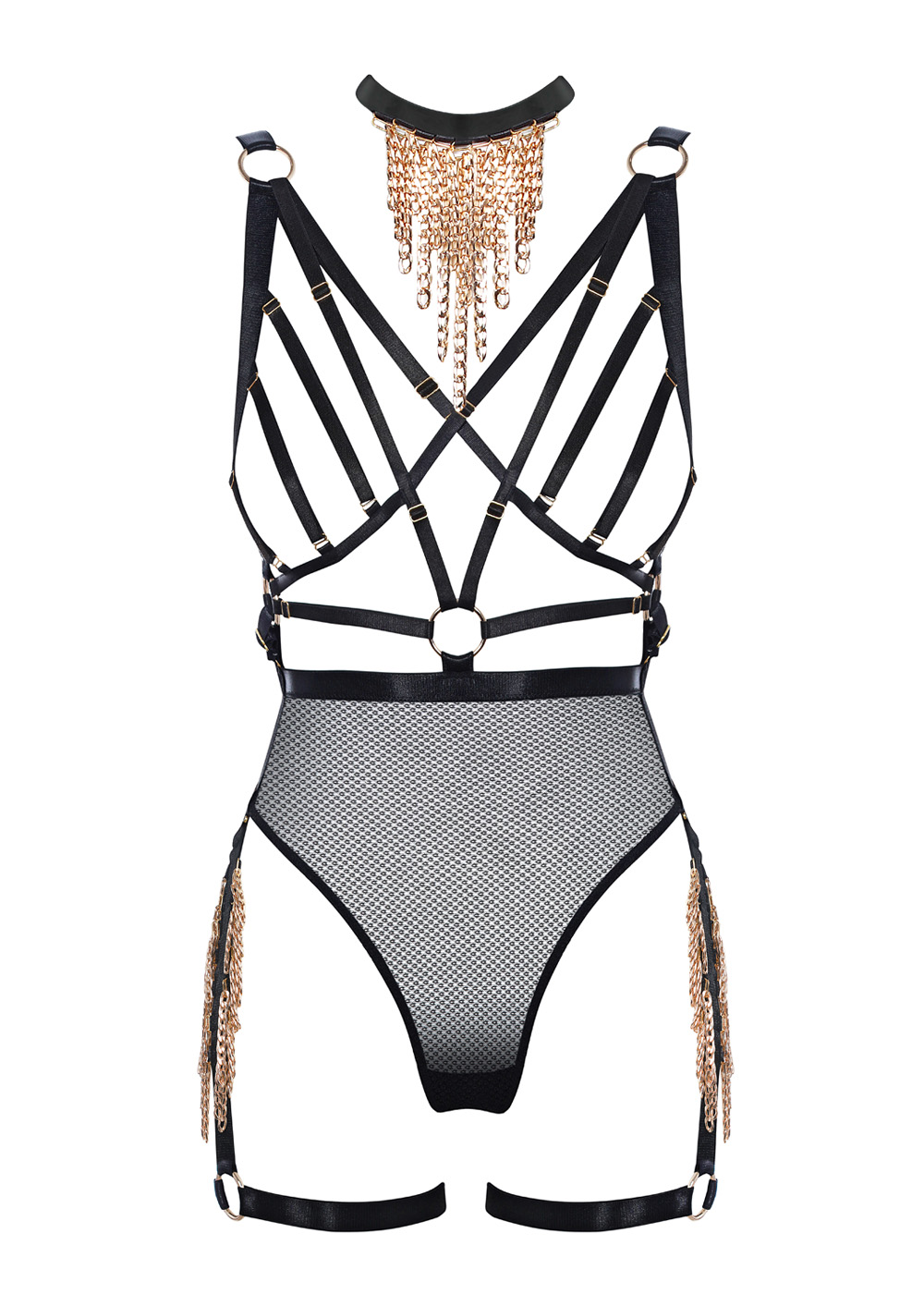 Представляем вашему вниманию сексуальный костюм "Либерти". Этот комплект выполнен из сетчатой ткани с декоративными золотыми цепями , что добавляет ему роскошности и изысканности. Боди из этого комплекта обеспечивает идеальную посадку и поддержку, при этом подчеркивая ваши формы. В комплект также входит элегантный чокер, чтобы завершить ваш соблазнительный образ.