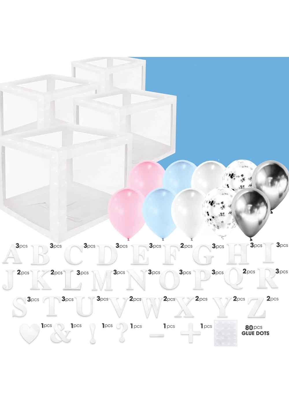 Наши серебряные кубы для шаров — идеальное решение для оформления праздника! Они отличаются прочностью и долгим сроком службы. В комплект входят буквы, шары и все необходимые аксессуары, а подробные инструкции обеспечивают простую сборку. Кубы подходят для многоразового использования на различных мероприятиях, таких как дни рождения и гендер пати.