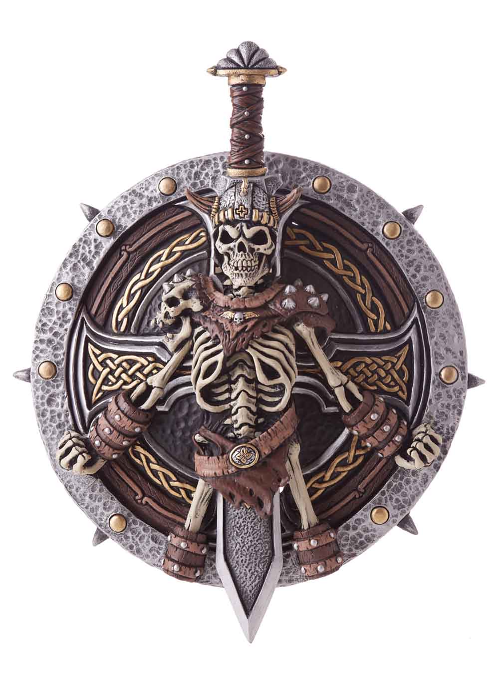 Лорд викингов Щит и меч, это оружие символизирующие силу и власть. На щите изображены меч и скелет с викингским шлемом, символизирующие бесстрашие. Щит создан для защиты в битве, а меч — для нанесения решающих ударов в борьбе. Вместе они составляют непобедимый арсенал настоящего лорда викингов, готового сразиться за славу и честь на поле боя.