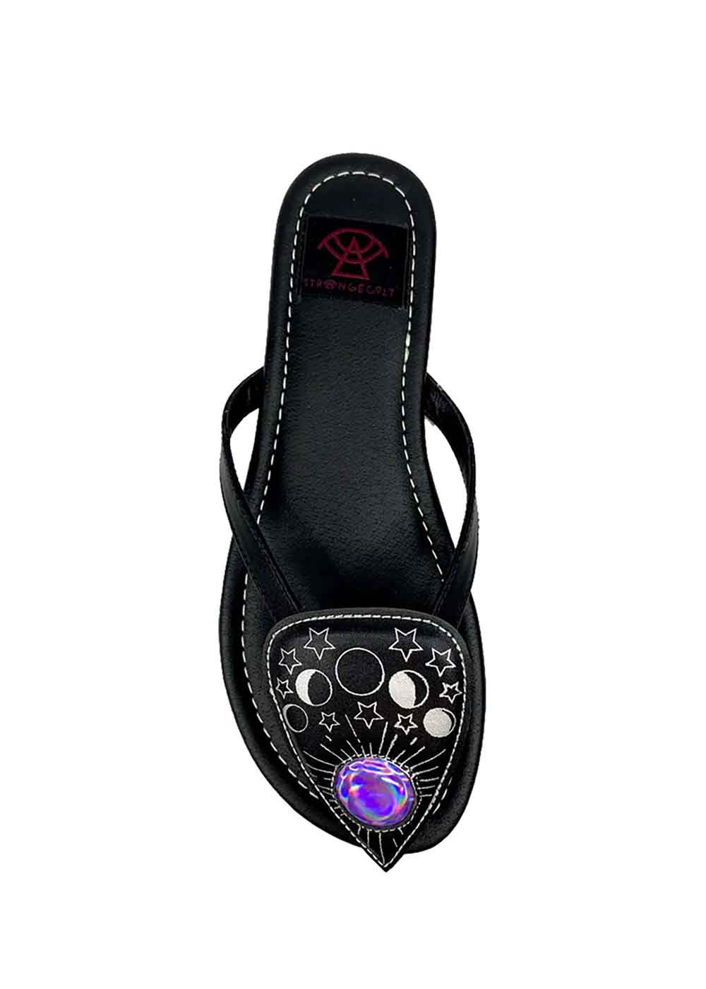Шлепанцы с камушком – стильный выбор для летнего гардероба. Изготовленные из веганской кожи с резиновой подошвой, они обеспечивают комфорт и надежность. Графический элемент, пришитый к передней части, добавляет изюминку в дизайн, а детали строчки и фиолетовый искусственный драгоценный камень придают элегантный и изысканный вид.