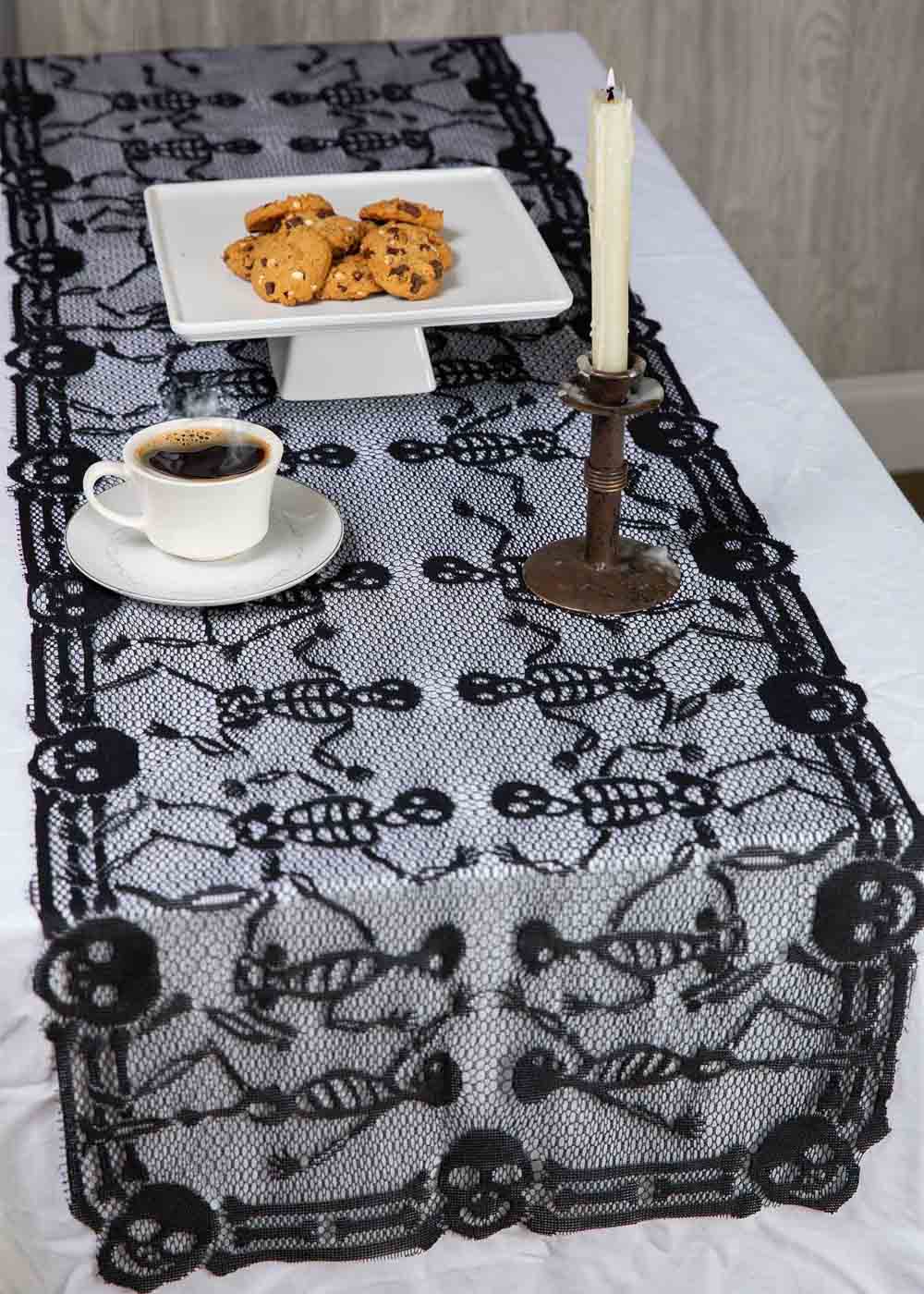 Скатерть Жуткие скелеты добавит атмосферу ужаса и веселья вашему праздничному столу. Длина скатерти составляет 198 см, ширина — 46 см. По каждому краю скатерти расположены вязаные ряды каркасов, а внутри танцуют ряды скелетов.