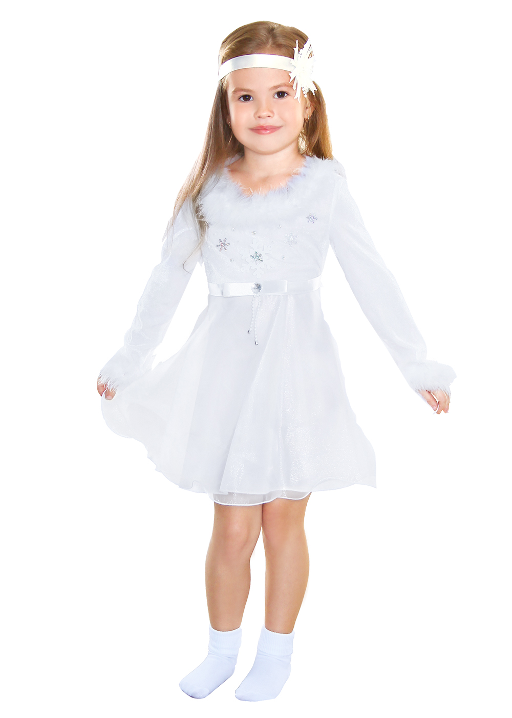 Костюм Снежинка лав продолжает тематику Новогодние костюмы, Снежинки.Белое платье средней длинны с длинным рукавом украшено пушистой вставкой на манжетах и линии ворота. На груди имеются снежинки разных размеров и декоративные камни. Пояс украшен атласной лентой, декоративным камнем и лентой с бусинами. Платье отлично садится по фигуре. Головной убор - повязка, сбоку имеется декорация в виде снежинки и бусин. Такой костюм не оставит Вас без внимания.