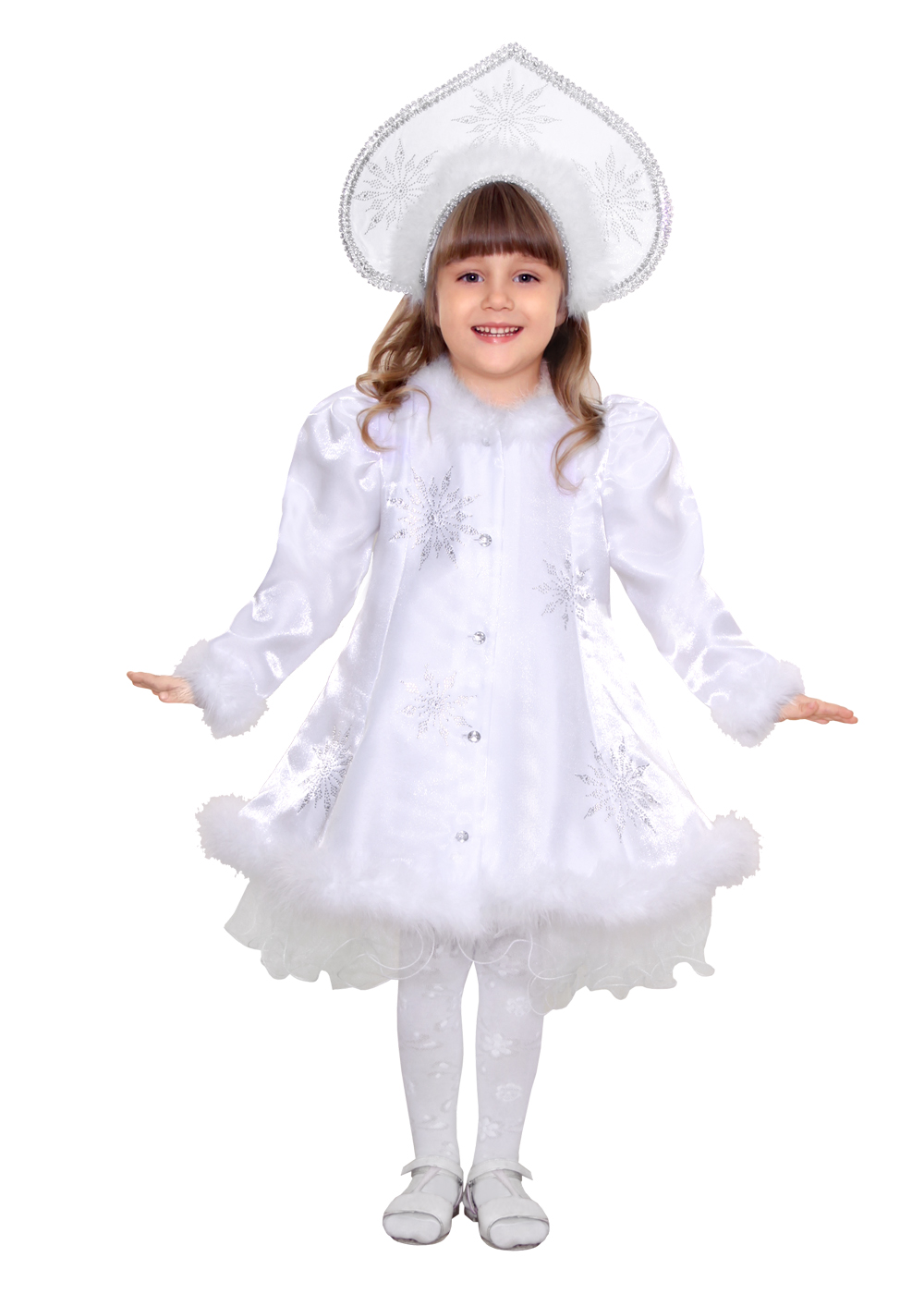 Основные ткани - атлас и фатин. Комплектация: платье, головной убор. Атласное платье украшено искусственным мехом на манжетах, подолу и вороту. Декорировано также платье снежинками из страз, пуговицы в виде декоративных камней. Роскошный головной убор в виде кокошника обшит декоративными камнями и снежинками из страз.