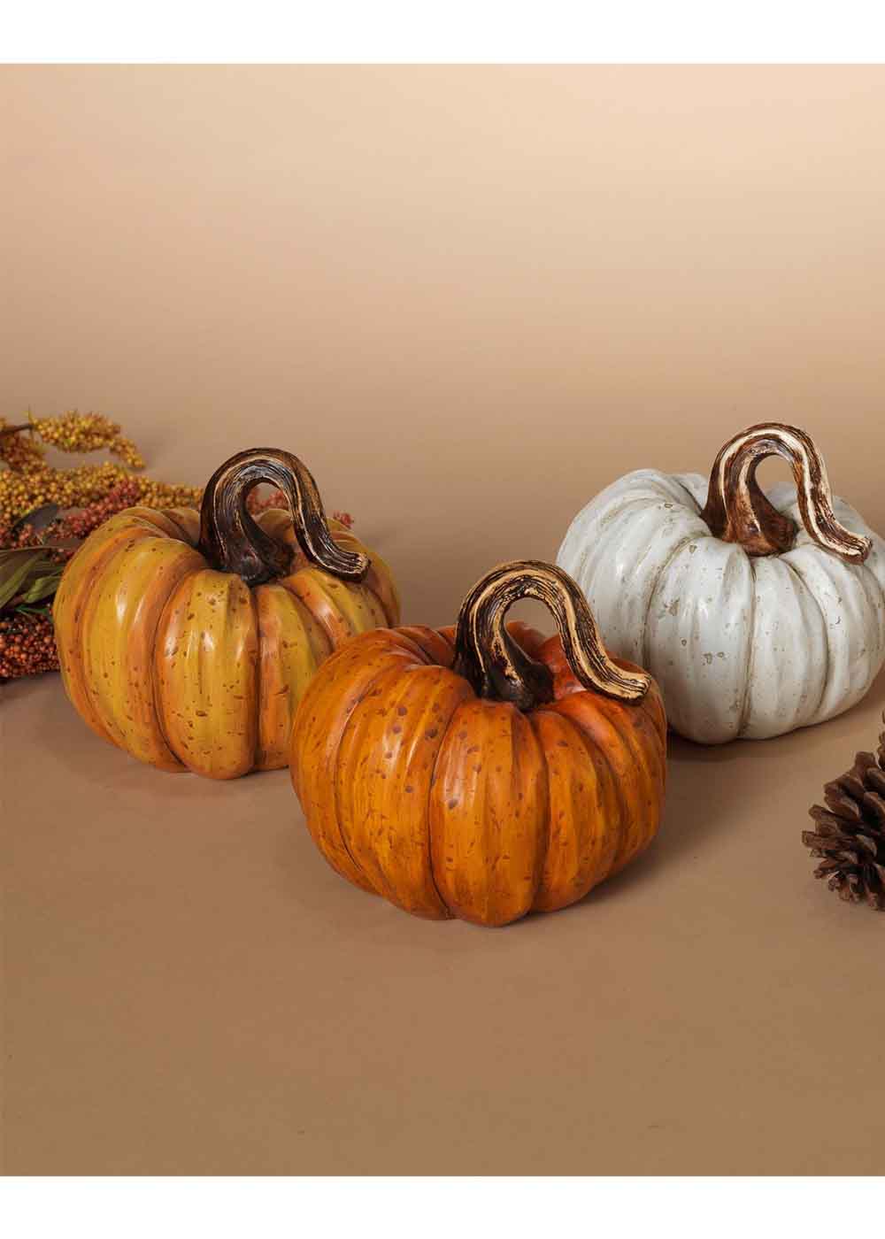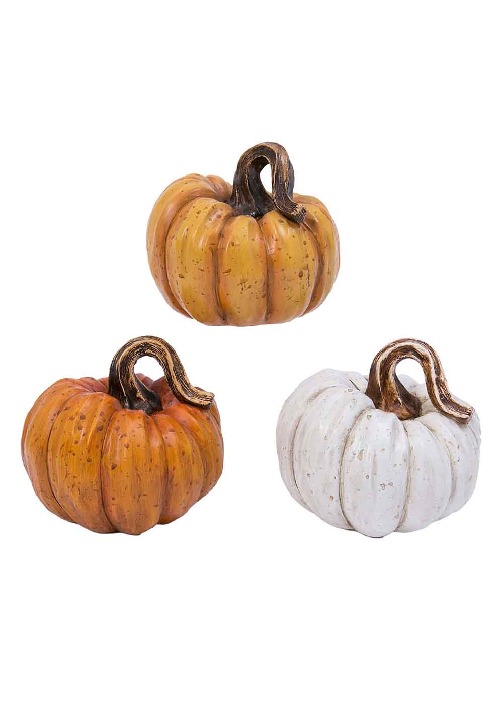 Статуэтка тыквы набор - компактные тыквы, высотой 10 см и диаметром 13 см, выполнены из формованной смолы и прекрасно подойдут для создания особенной атмосферы в вашем интерьере. В наборе три тыквы: две из них окрашены в классический оранжевый цвет, а третья – в жемчужно-белый, чтобы создать приятный контраст и добавить изысканности вашему декору.
