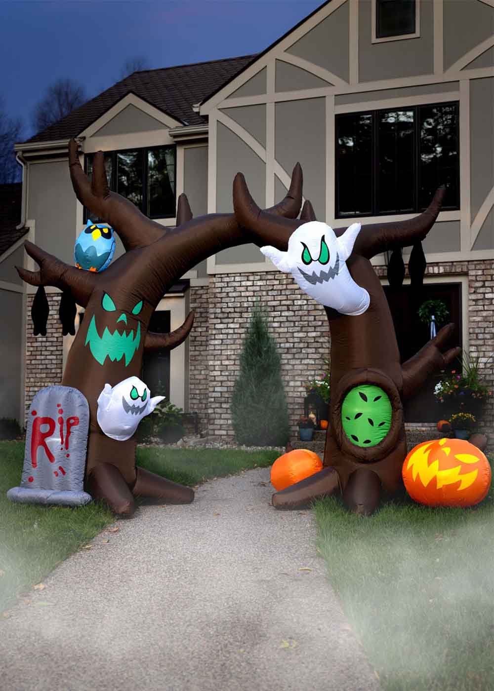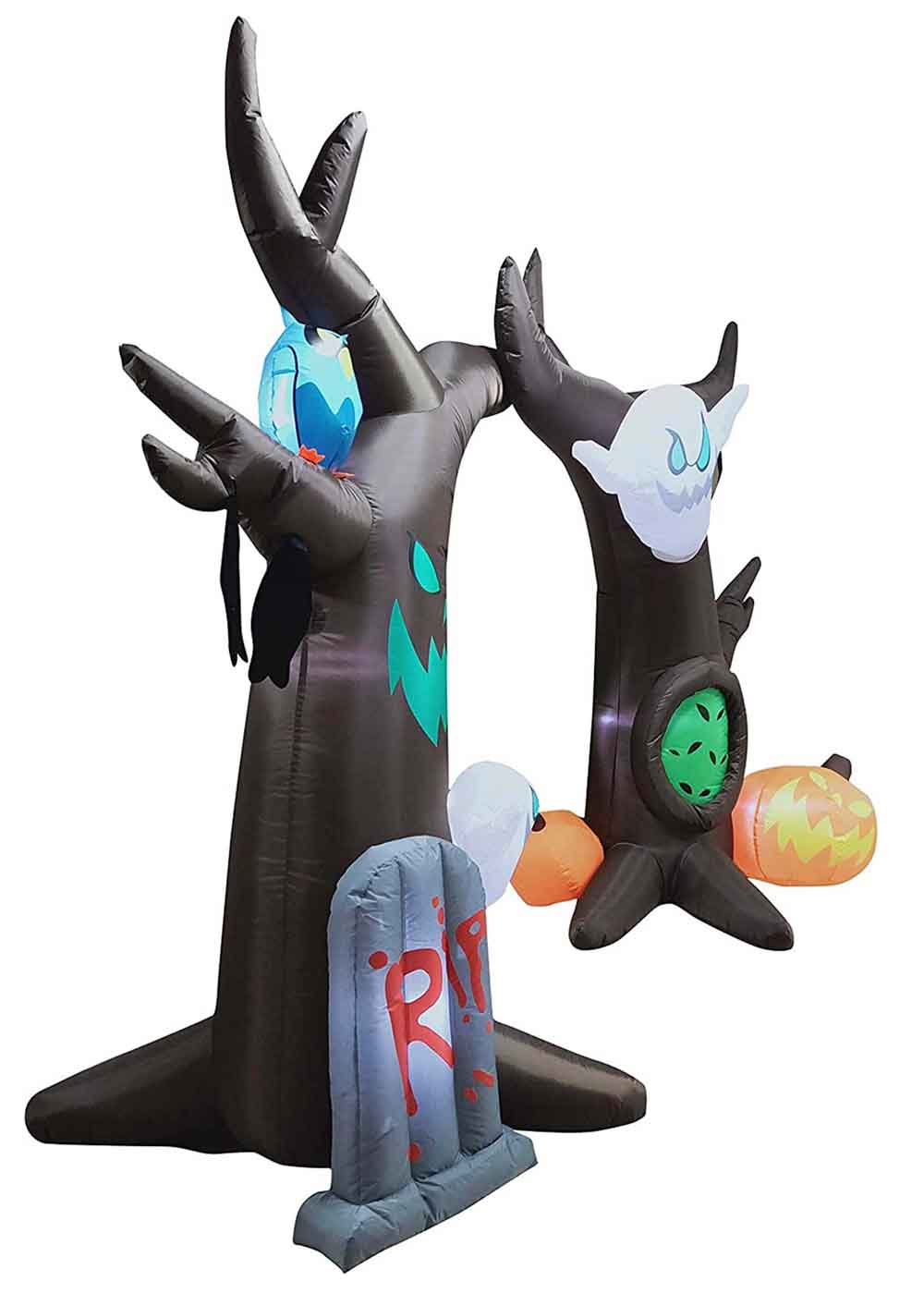 Страшное дерево Арка - величественный элемент Хэллоуинского декора. Арка имеет высоту 244 см. Встроенные грузовые сумки в основании обеспечивают стабильность и устойчивость. Подключается к любой стандартной розетке для удобства использования. Привязные шнуры легко прикрепить к петлям надувной лодки с помощью карабинов, а свободные концы шнуров можно надежно закрепить к земле с помощью кольев, обеспечивая дополнительную устойчивость и безопасность.