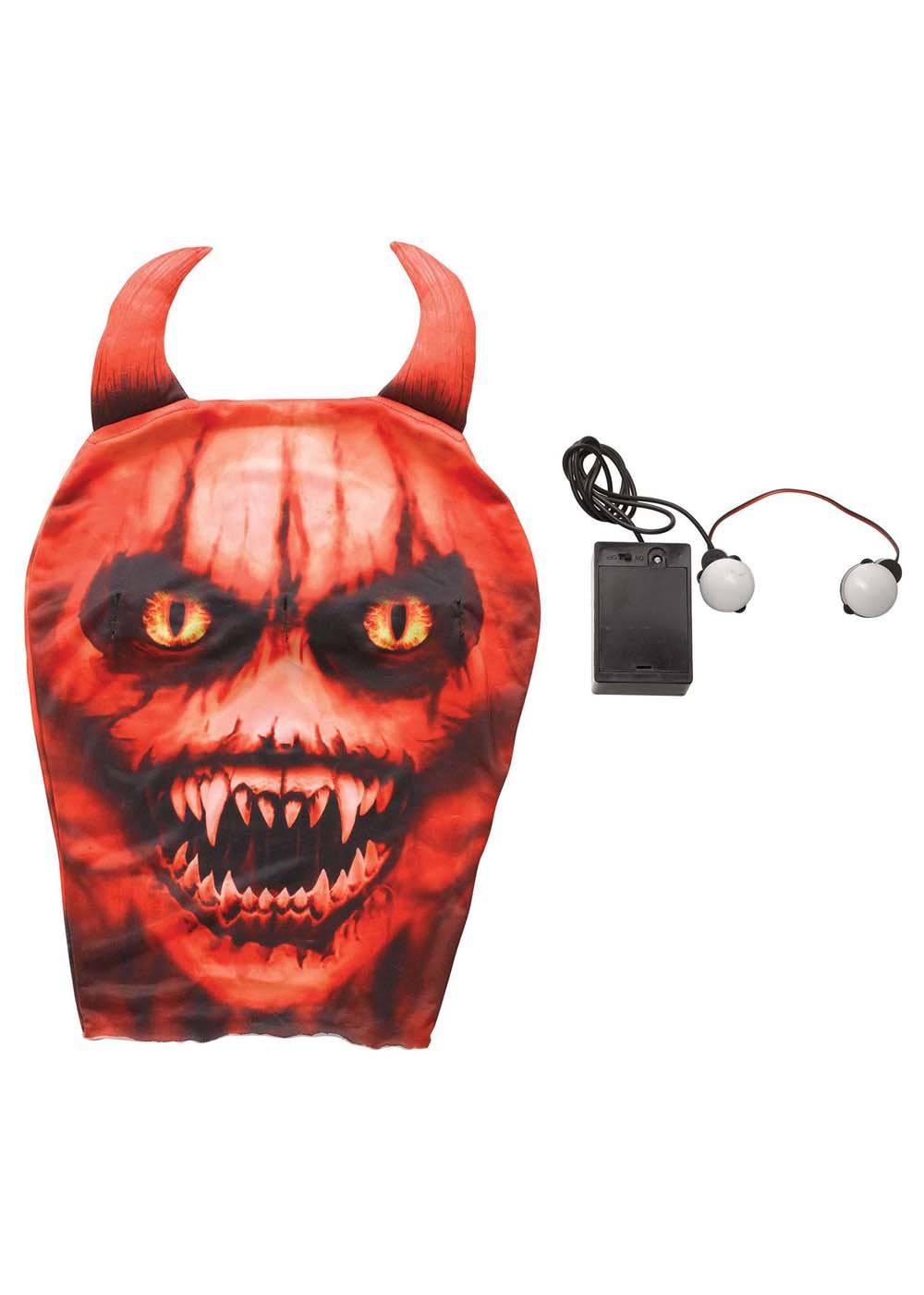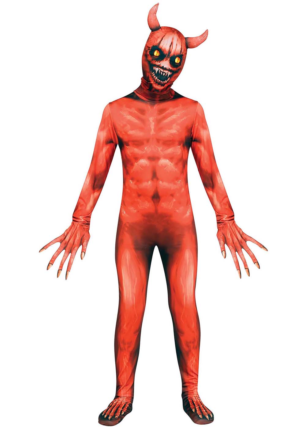 Страшный злой дьявол представляет собой невероятно устрашающий костюм. Эластичный комбинезон застегивается на молнию по центру спины для удобства. Полностью закрытые перчатки с наполнителем на кончиках пальцев и печатной графикой создают эффект устрашающих когтей, ноги костюма оформлены аналогичной графикой. Маска пуловер с наполнителем в рогах и печатной графикой завершает образ, а внутренний механизм затемнения глаз с застежкой липучкой позволяет легко настраивать видимость.