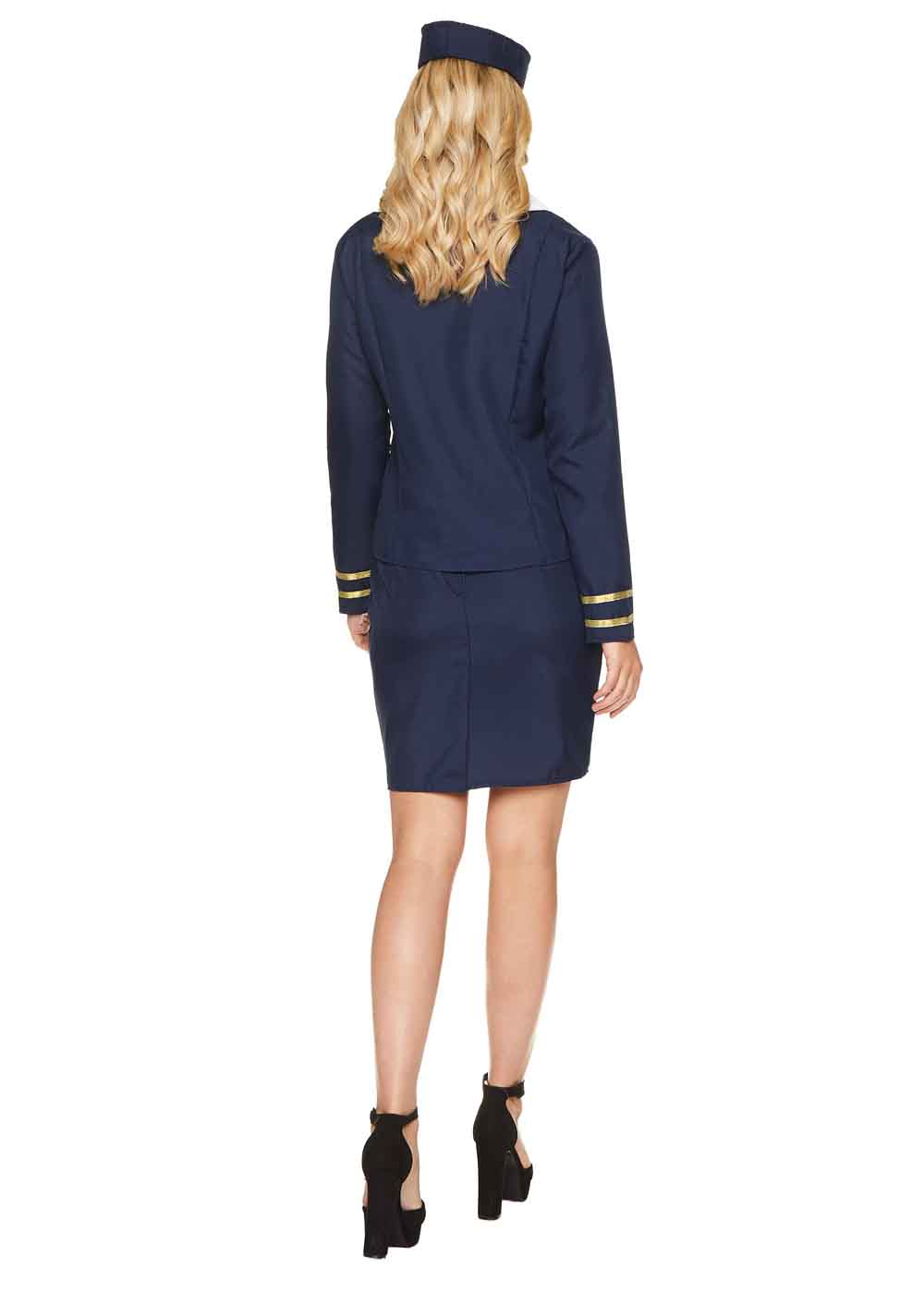 Костюм стюардессы кежуал включает пиджак с двумя пуговицами по центру спереди, одна из которых функциональная, а другая декоративная. Вставка блузки имеет 2 функциональные пуговицы внизу по центру. Юбка-карандаш застегивается на молнию сзади и имеет эластичные боковые панели.