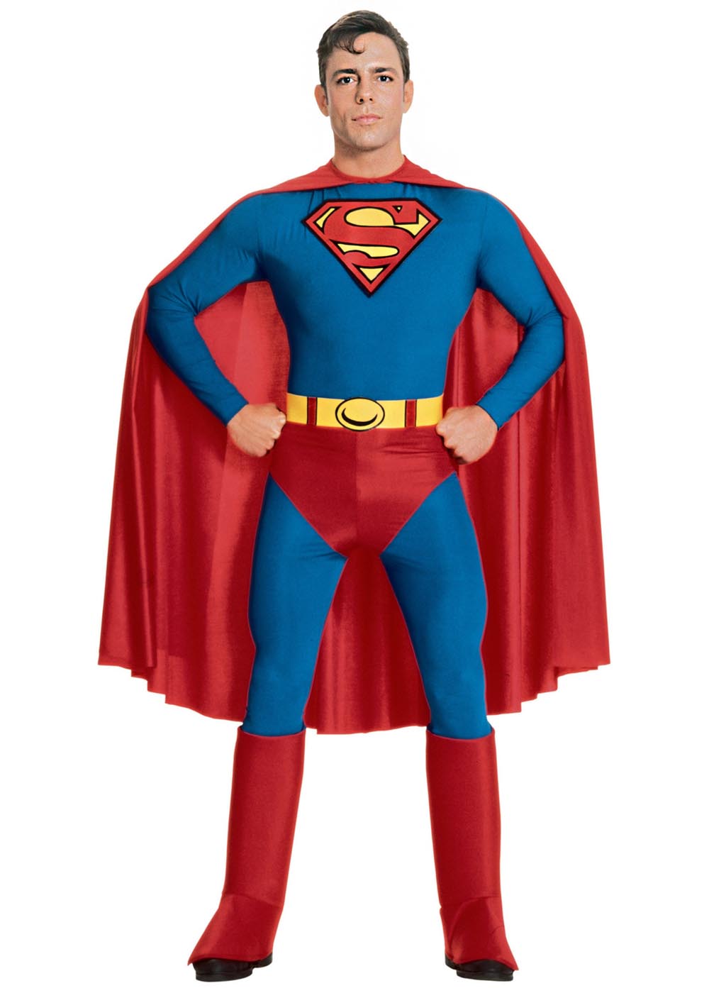 Костюм "Супермена" включает комбинезон с завязками из ткани, напечатанную букву "S" на груди, прикрепленные накладки из пены на ботинки с эластичными лентами подошвы, пояс из пены с завязками из ткани на талии, плащ с завязками из ткани на шее.