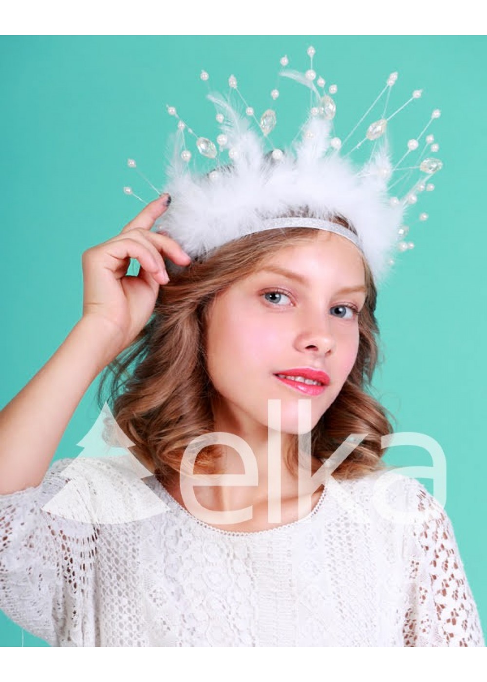 Комплект состоит из короны. Состоит из основания, меха и украшений. Основной цвет - белый. Блестящая лента белого цвета как основание, декорирована леской с бусинами и декоративными камнями. Украшение в виде искусственного меха добавляет нежности в образ.