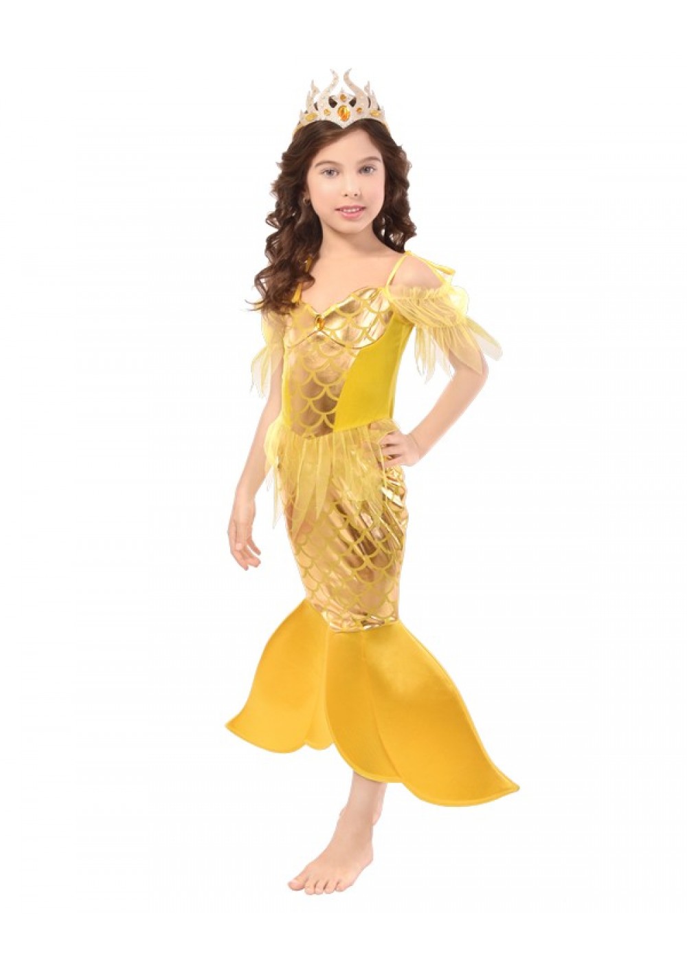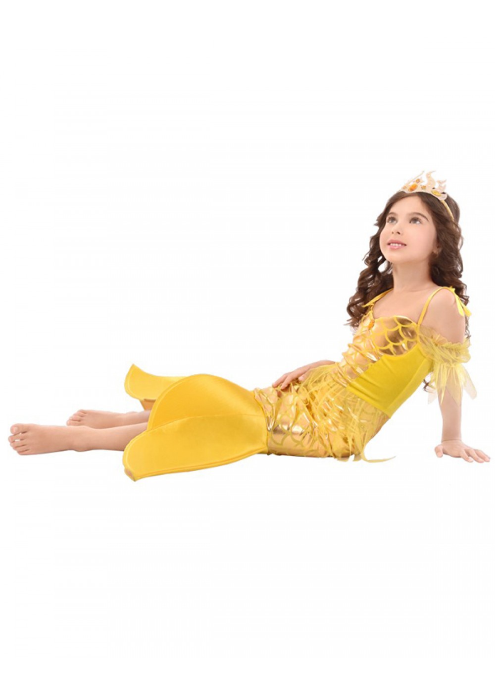 В комплект входит платье и головной убор. Основные ткани - велюр и полиэстер высокого качества. Верх платья сделан под корсетный фасон, декорирован вставкой желтого велюра по бокам. На груди украшение в виде оранжевого декоративного камня. Фатиновые рукава добавляют нежности наряду. Облегающая юбка с узором чешуи, как и верхняя часть гармонично смотряться. Снизу имитирован хвост желтого цвета. Головной убор с декоративными камнями и стразами завершает образ.